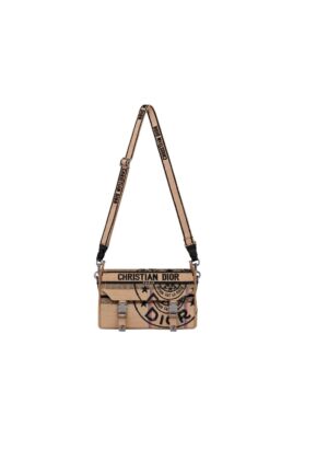 • Maria Grazia Chiuri has updated the classic messenger bag by adding signature Dior details for a relaxed and modern look. Crafted in beige jute embroidered canvas, the bag features the ‘L’Union Fait la Force’ motto, inspired by the atelier’s jute bags and reaffirming the participative dimension dear to Maria Grazia Chiuri. A ‘CHRISTIAN DIOR PARIS’ signature flap and sportswear-inspired ‘CD’ buckles in ruthenium-finish brass complete the small design. Equipped with an adjustable and removable shoulder strap, the compact messenger bag can be worn over the shoulder or crossbody, and will make an ideal urban companion.