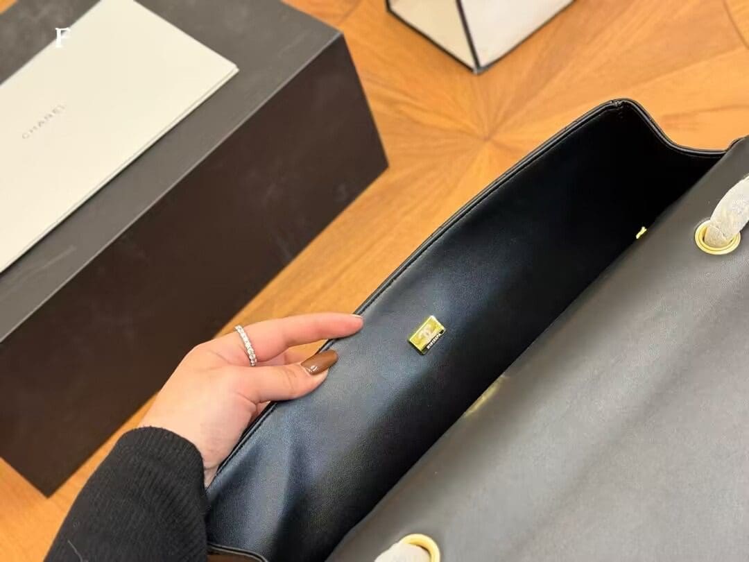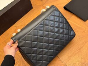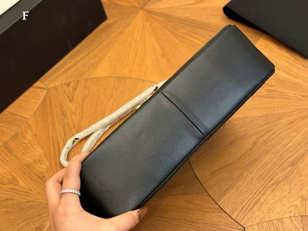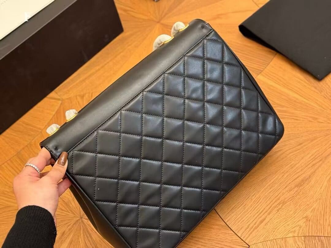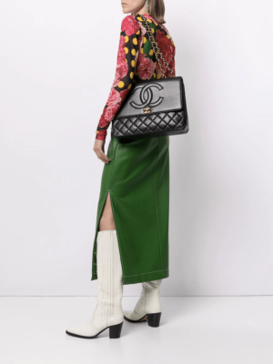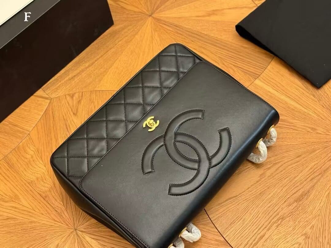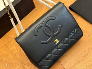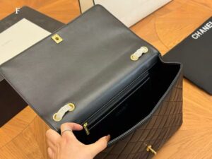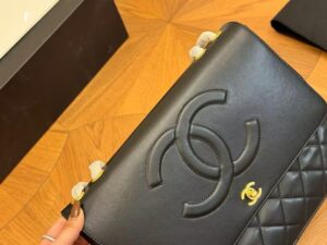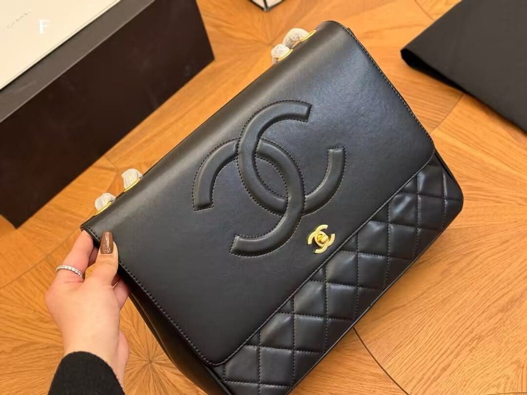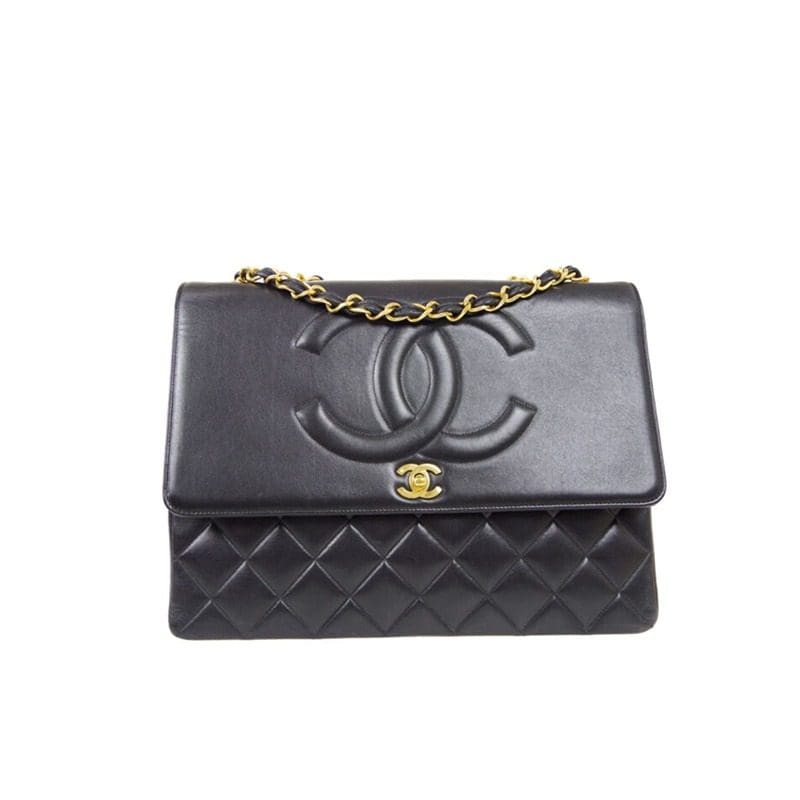 Diamond quilting, iconic CC logo, shoulder strap with chain and leather strap, front flap closure, CC twist lock, main compartment, interior zip pocket, interior slant pockets, interior logo stamp, back slit pocket, gold-tone hardware. Color: Black. Material: lamb leather.