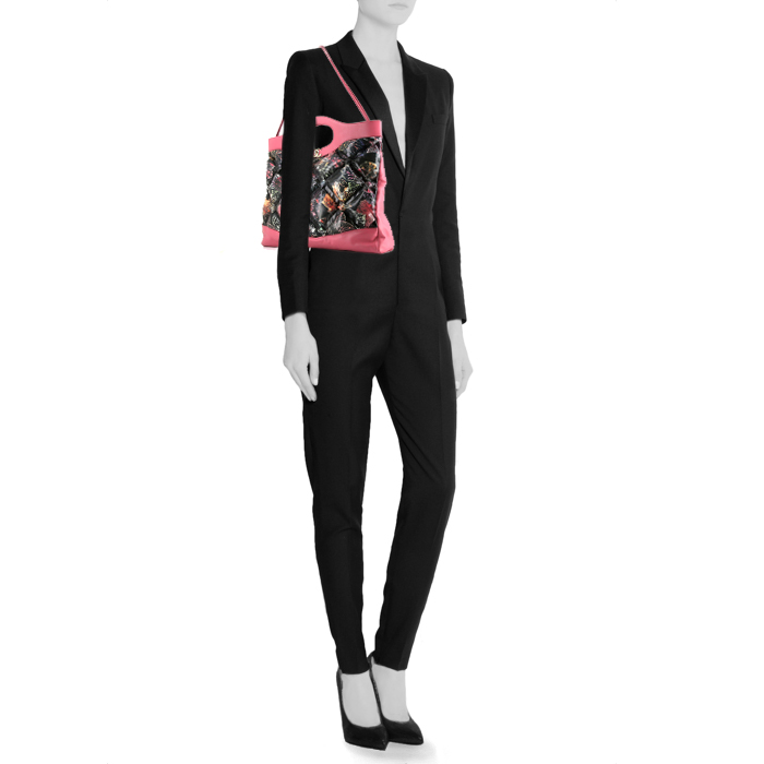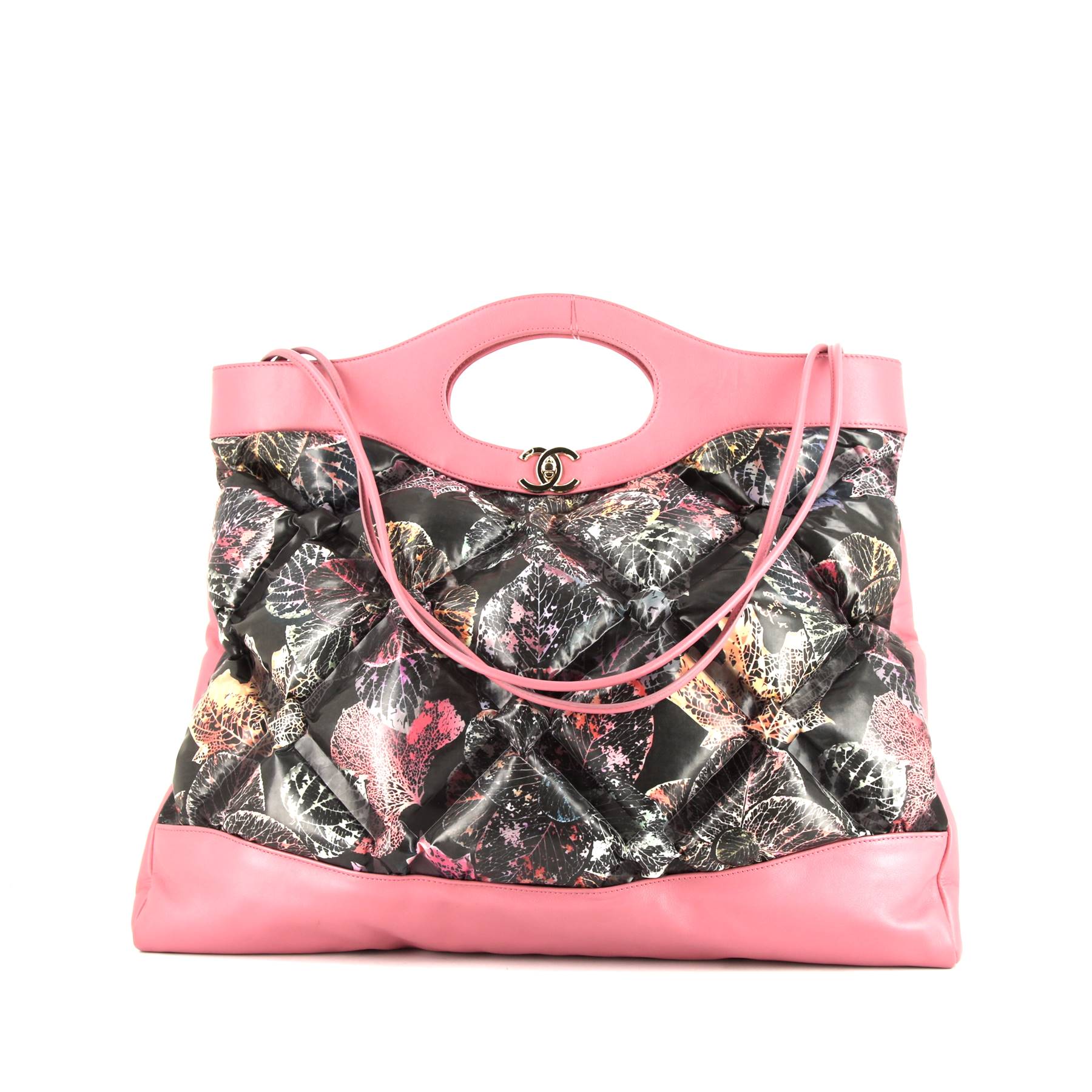Chanel 31 handbag in black quilted canvas and pink leather