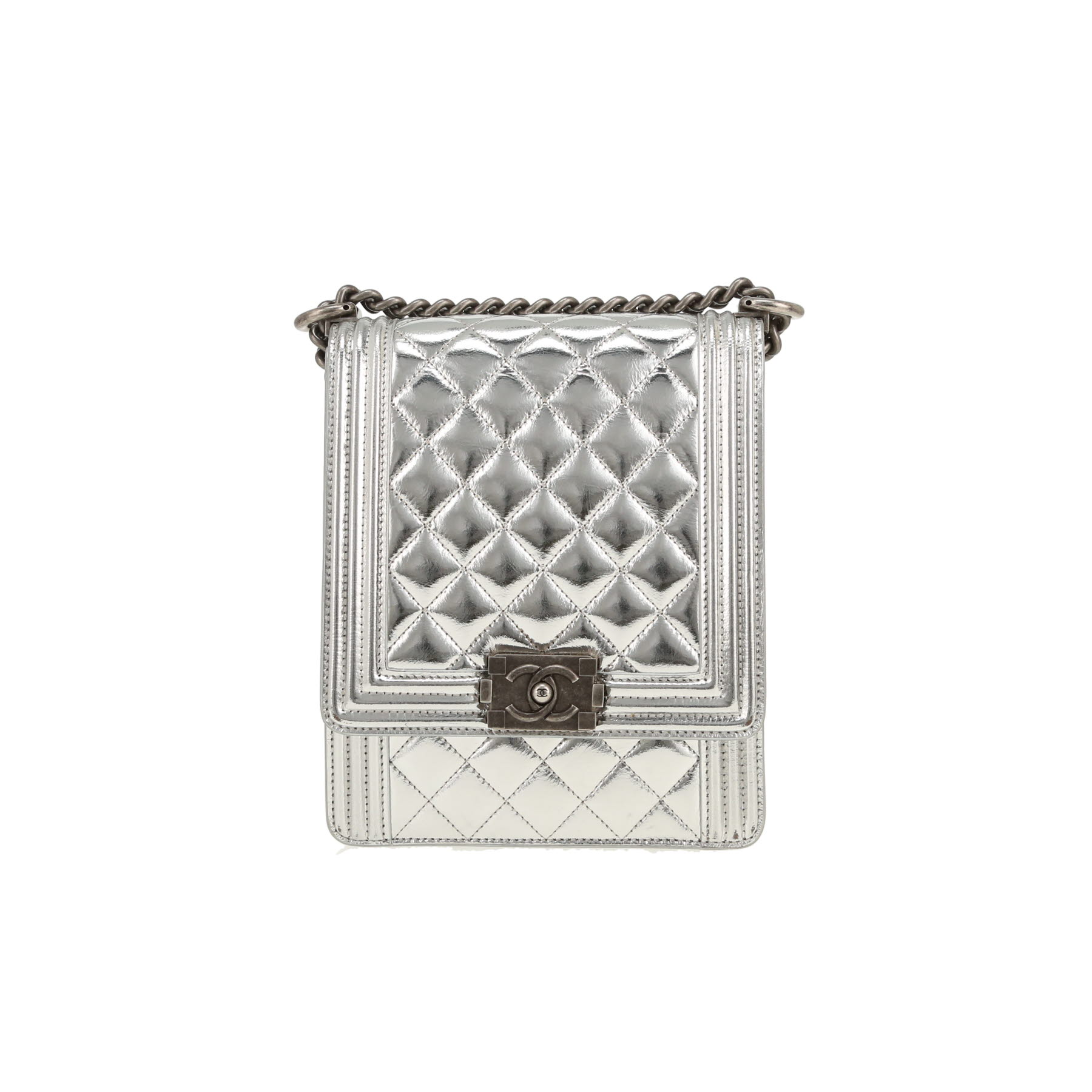 Chanel Boy shoulder bag in silver patent quilted leather