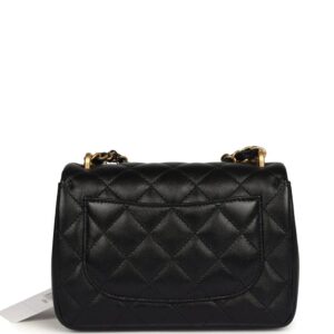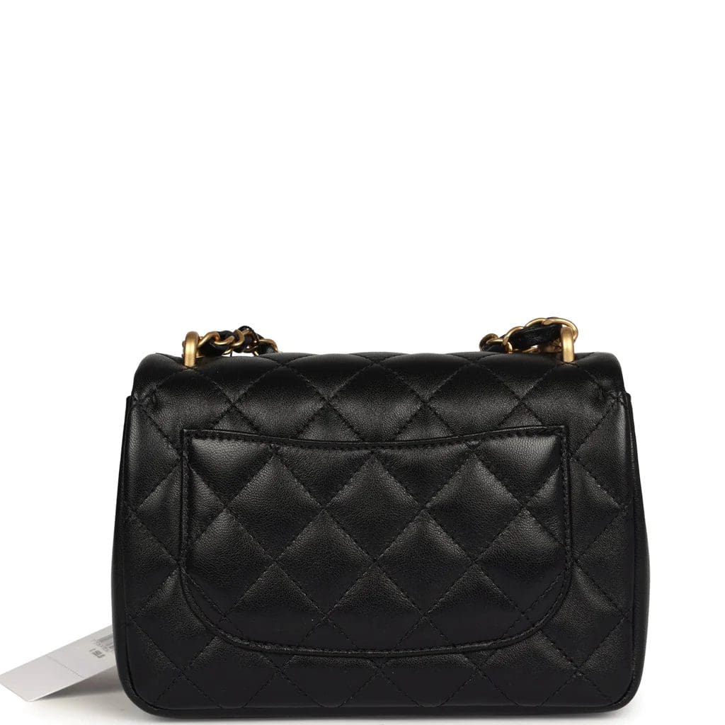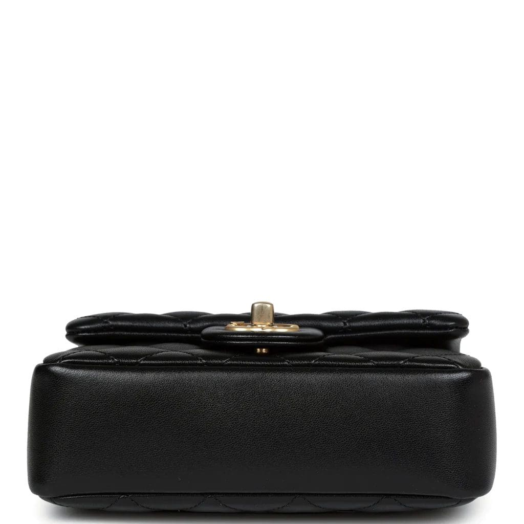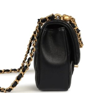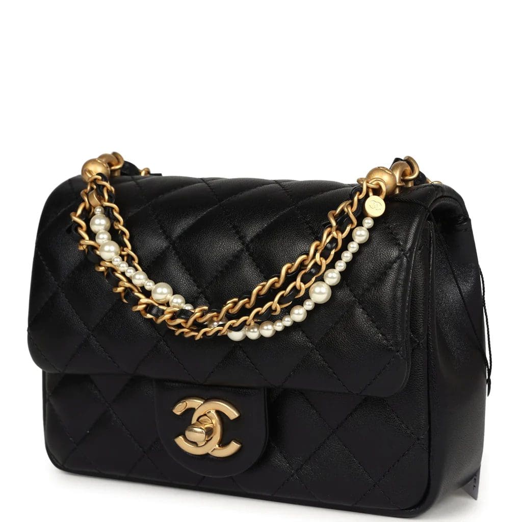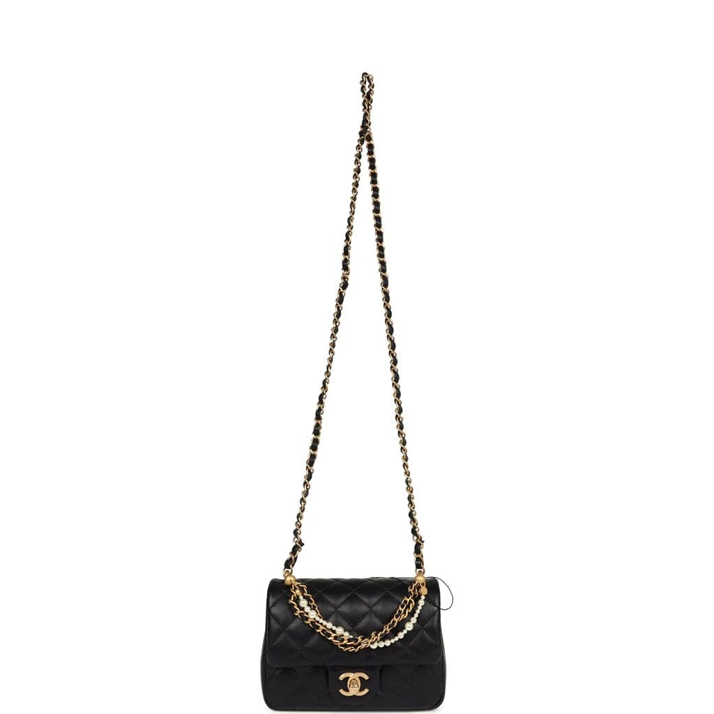 This Mini Square Pearl Crush Flap Bag is of black lambskin leather with brushed gold tone hardware. It has a front flap with signature CC turnlock closure, tonal stitching, rear half moon pocket, a single interwoven black leather and brushed gold tone chain link shoulder/crossbody strap and faux pearl top handle strap.