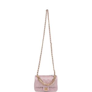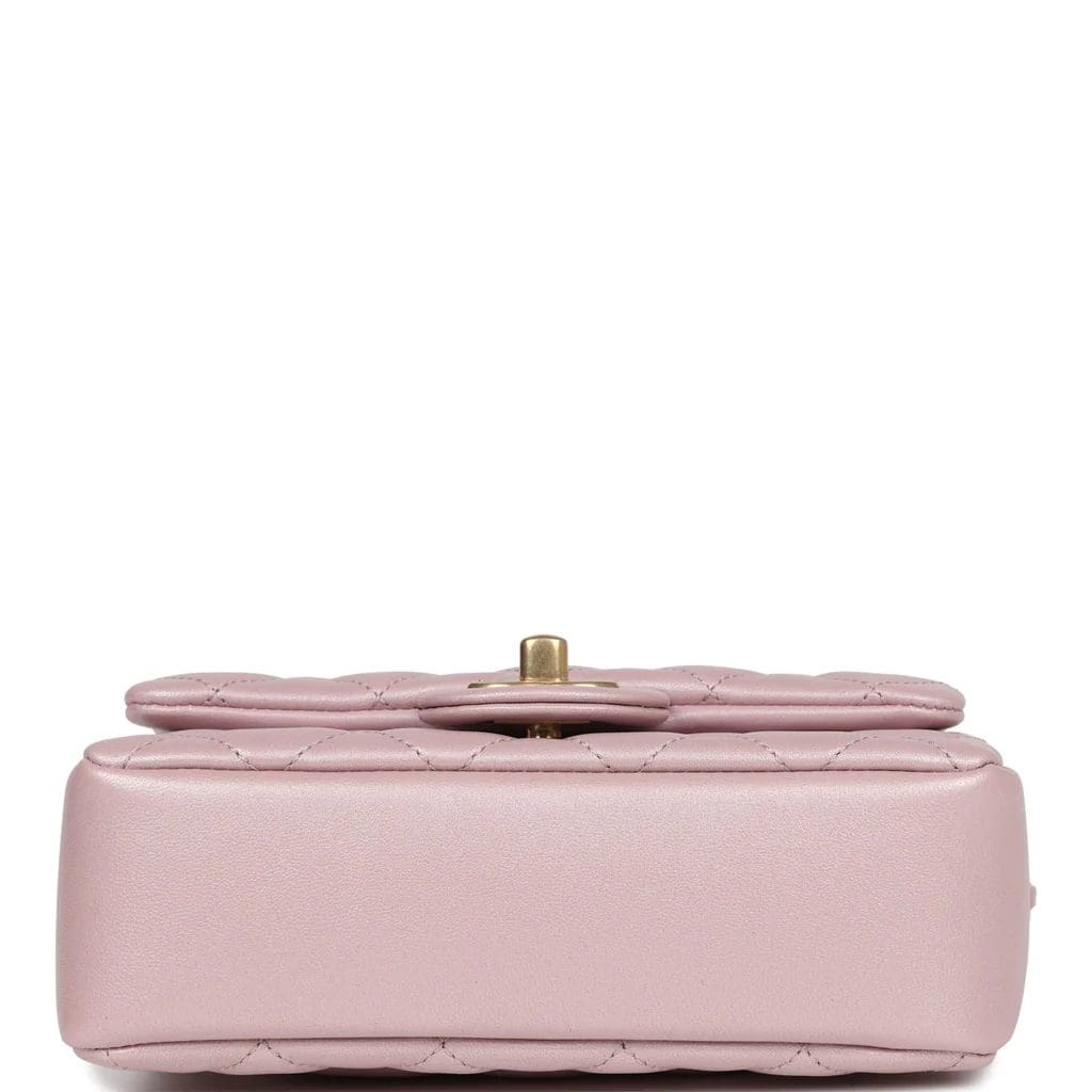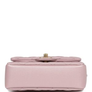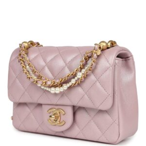 This Chanel mini square pearl Flap Bag is of light pink iridescent lambskin leather with brushed gold tone hardware, has a front flap with signature CC turnlock closure, tonal stitching, rear half moon pocket, a single interwoven light blue leather and brushed gold tone chain link shoulder/crossbody strap and a pearl and chain top handle strap.