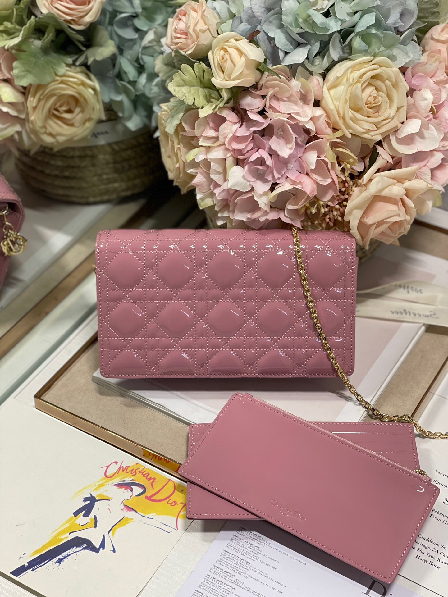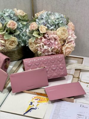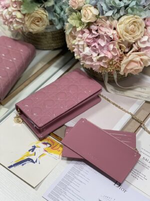The Lady Dior pouchis distinguished by the emblematic Cannage topstitching and a detachable ‘D.I.O.R.’ charm. This unique accessory may be worn with or without its chain strap and features two removable elements: a card holder and a zipped pouch. Each may be carried individually. The pouch will instantly stand out and pairs well with other pieces from the same line.