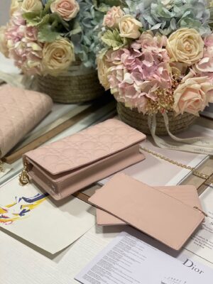 The Lady Dior pouchis distinguished by the emblematic Cannage topstitching and a detachable ‘D.I.O.R.’ charm. This unique accessory may be worn with or without its chain strap and features two removable elements: a card holder and a zipped pouch. Each may be carried individually. The pouch will instantly stand out and pairs well with other pieces from the same line.