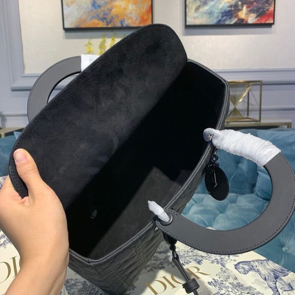 The Lady Dior handbag epitomizes the House’s vision of elegance and beauty. Sleek and refined, the timeless yet relevant style is crafted in black material with Cannage stitching, creating the instantly recognizable quilted texture. The pale black-finish metal ‘D.I.O.R.’ charms lend a polished touch to the style. Featuring a thin, removable shoulder strap, the large Lady Dior bag can be carried by hand, worn over the shoulder or crossbody as an ideal evening companion.