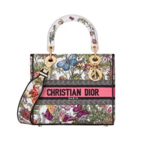 The Lady D-Lite bag combines classic elegance with House modernity. The style is fully embroidered with a white multicolor Mexico Millefiori motif by Pietro Ruffo, showcasing butterflies and Mexican flowers in an elegant and colorful spirit. Featuring a wide, removable embroidered shoulder strap, the medium Lady D-Lite bag can be carried by hand or worn crossbody.