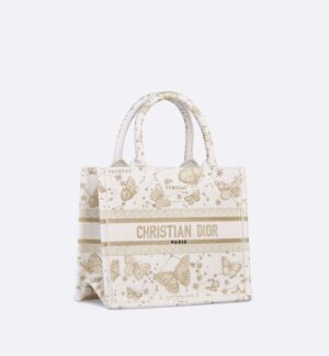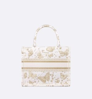 Introduced by Maria Grazia Chiuri, Creative Director of Christian Dior, the Dior Book Tote has become a staple of the Dior aesthetic. Designed to hold all the daily essentials, the style is fully embroidered with a white and gold-tone Butterfly Zodiac motif by Pietro Ruffo, showcasing a constellation enhanced by astrological signs and adorned with butterflies. Adorned with the Christian Dior Paris signature on the front, the small tote exemplifies the House’s signature savoir-faire and may be carried by hand.