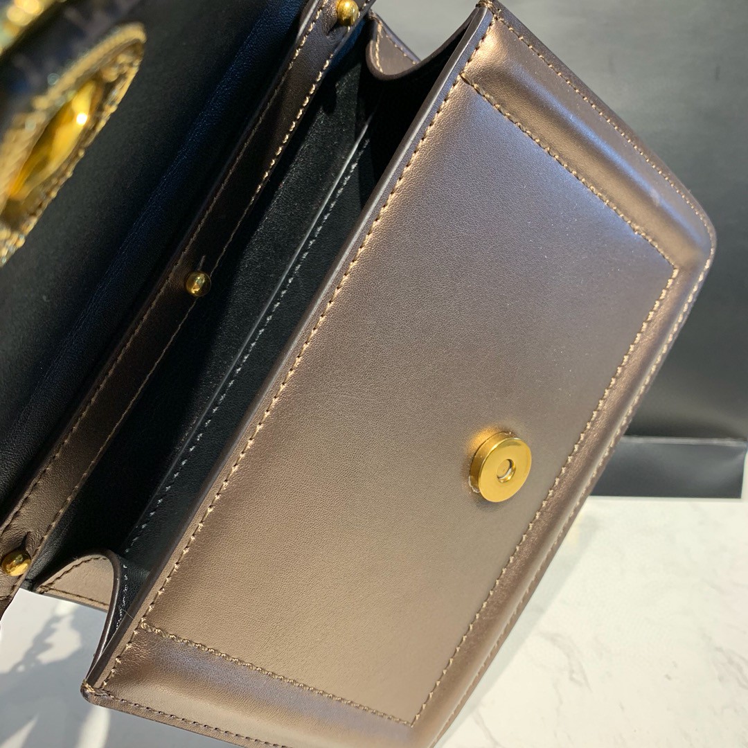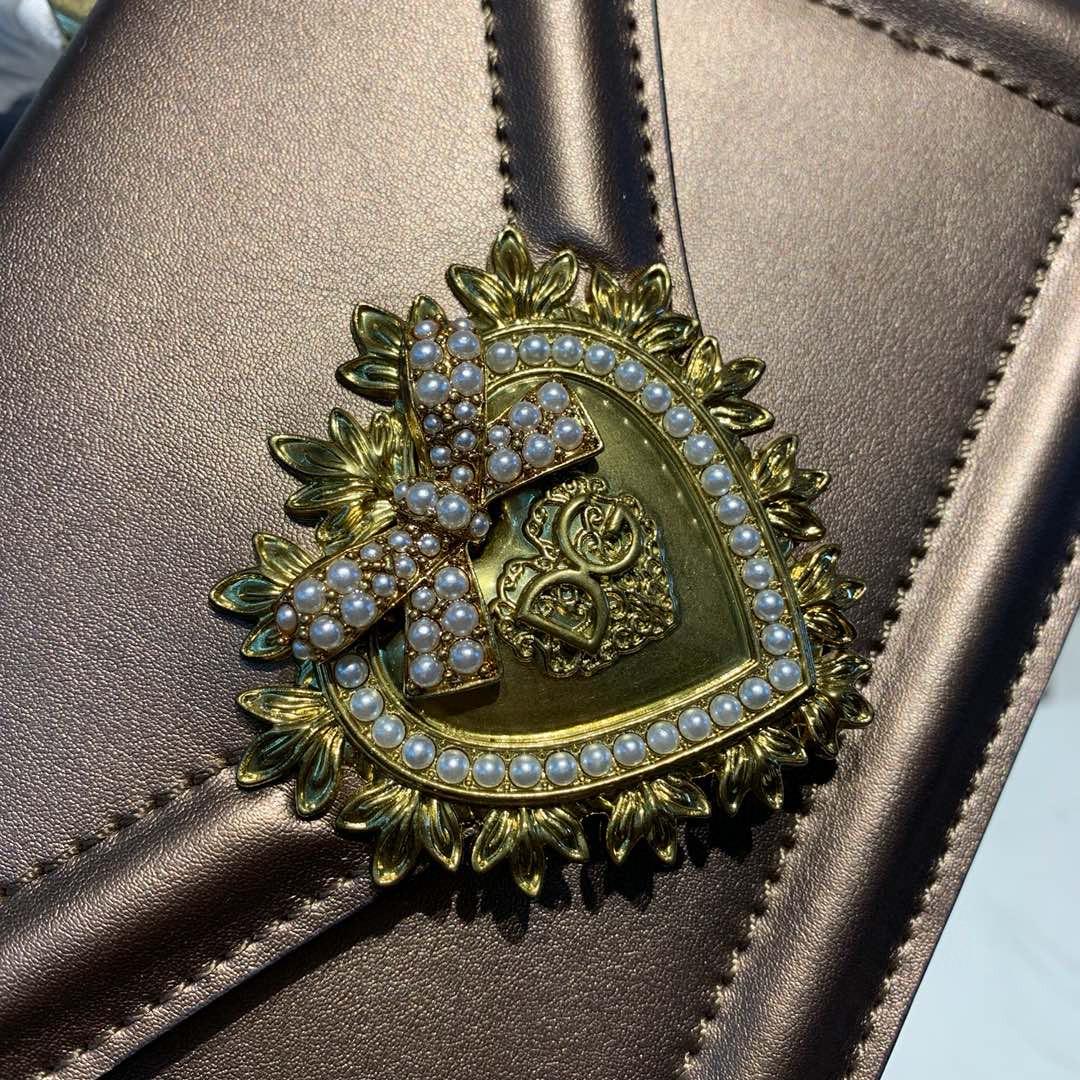 Front flap with bejeweled branded heart hand-tooled from a metal alloy with pearl inlay