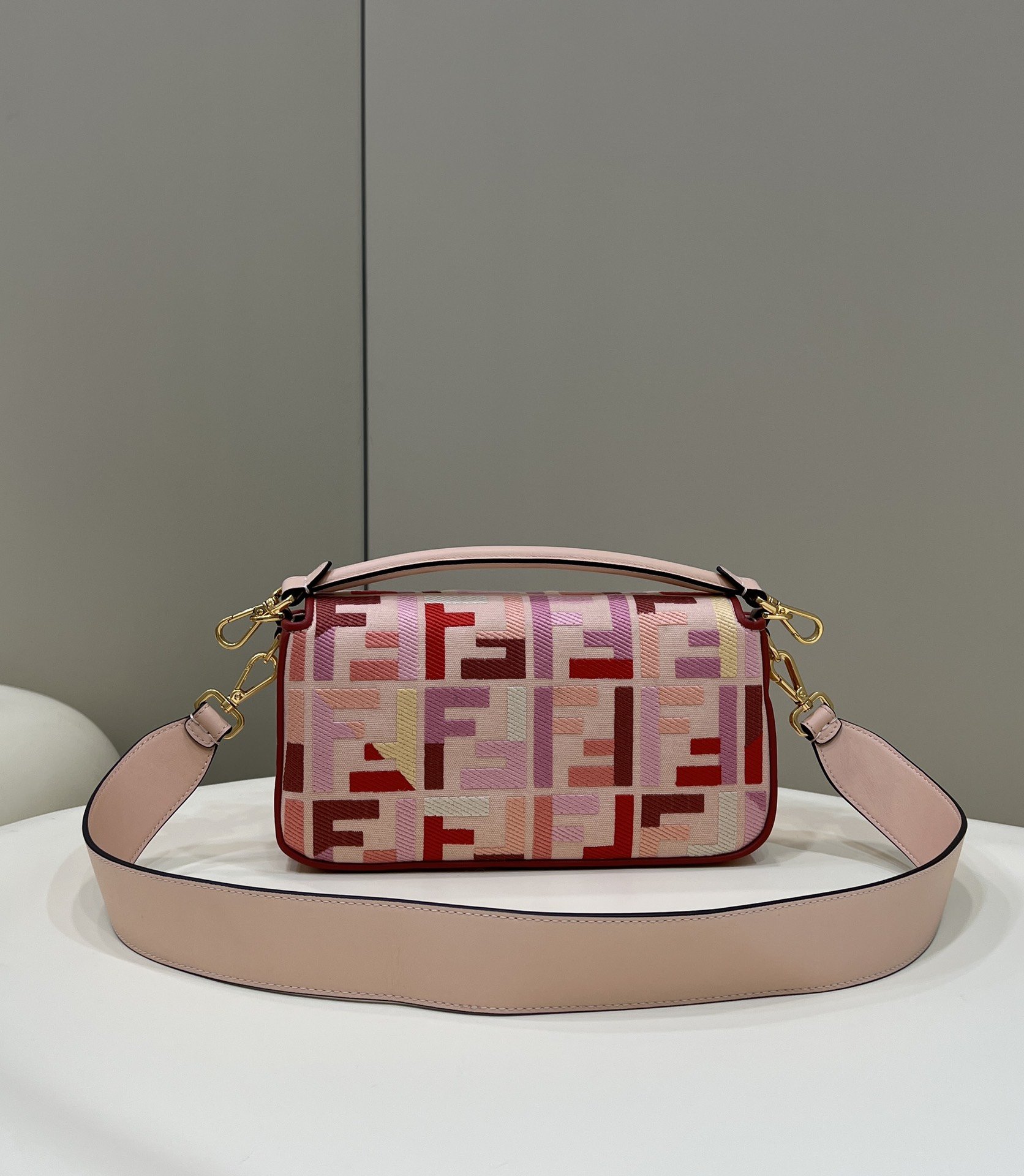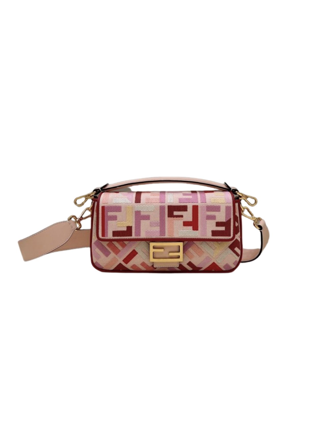Iconic medium Baguette bag made of pink canvas with a multicolor raised embroidery FF motif, trimmed in tone on tone. Decorated with an FF clasp. Can be carried by hand, or worn either on the shoulder or cross-body thanks to the handle and shoulder strap, both detachable.