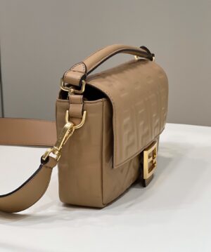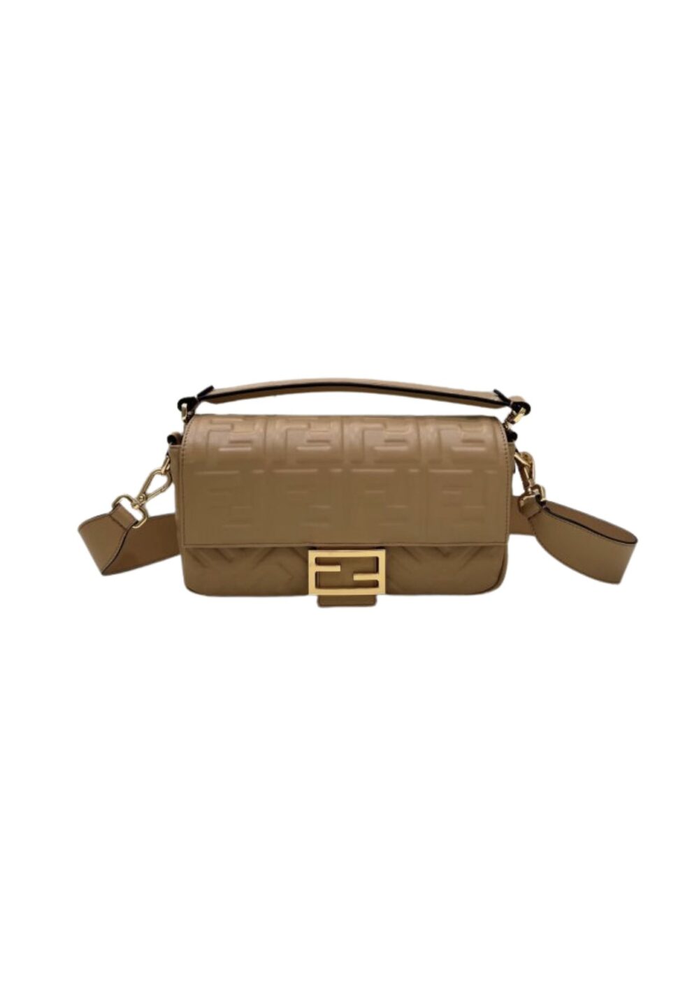 Iconic medium Baguette bag made of light brown soft nappa with a three-dimensional texture FF motif. The bag can be carried by hand, or worn either on the shoulder or cross-body thanks to the handle and shoulder strap, both detachable.