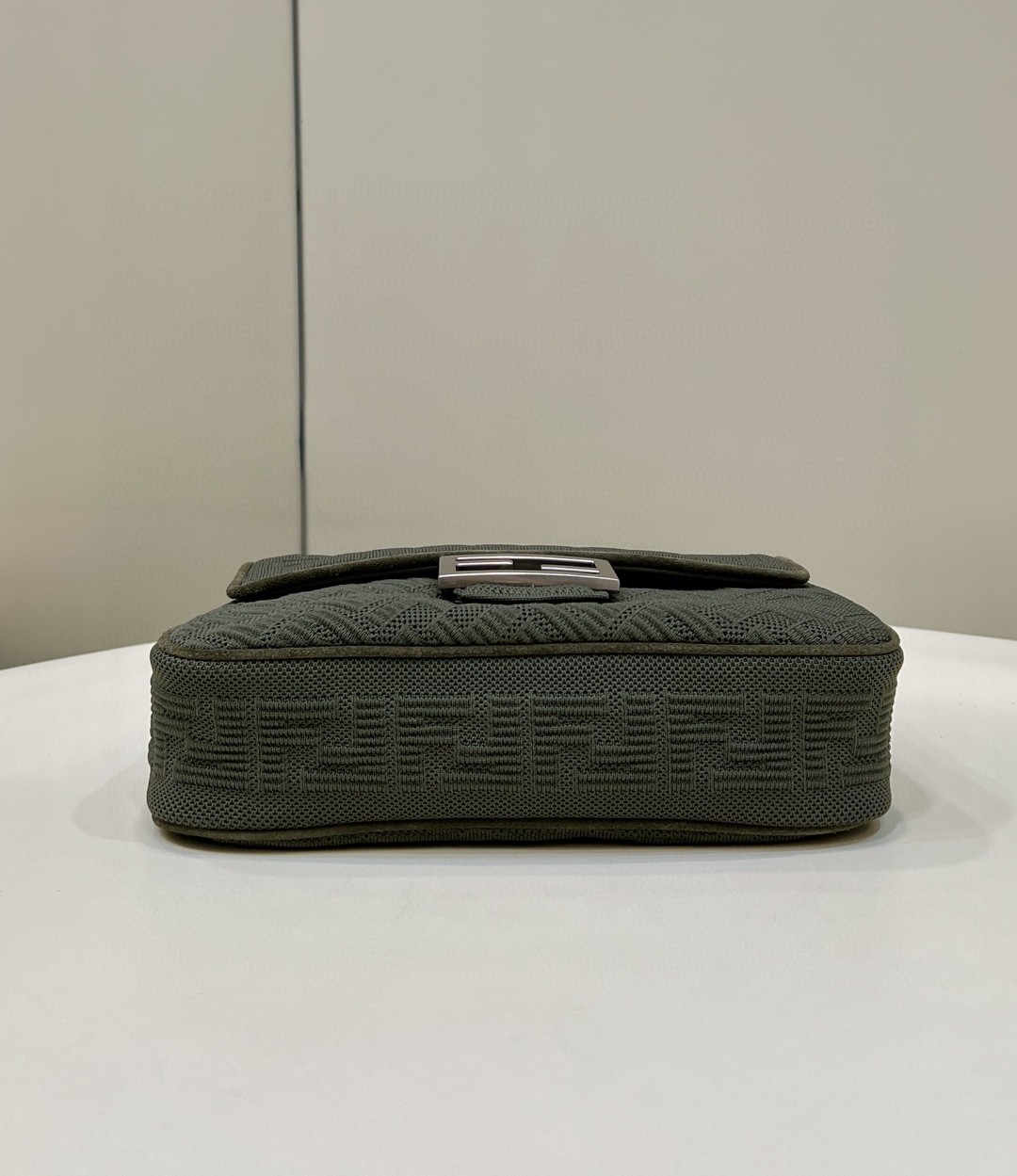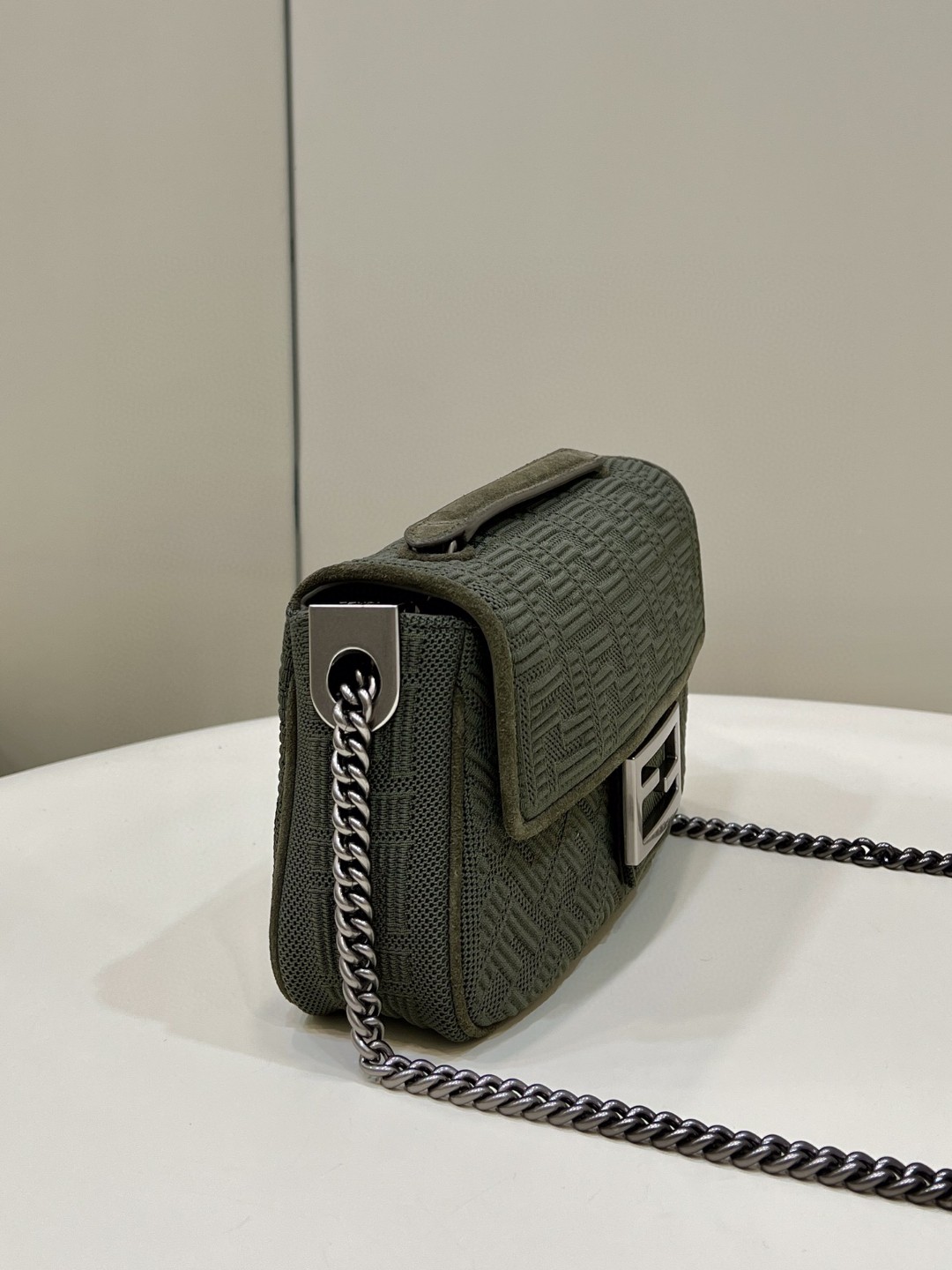 Iconic medium Baguette bag with chain shoulder strap, made of olive green technical mesh with a 3D texture FF motif. Decorated with an FF clasp.