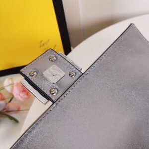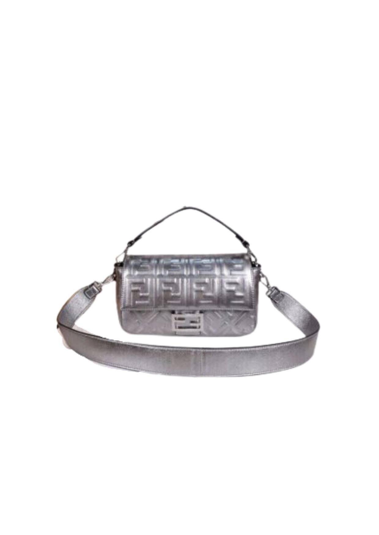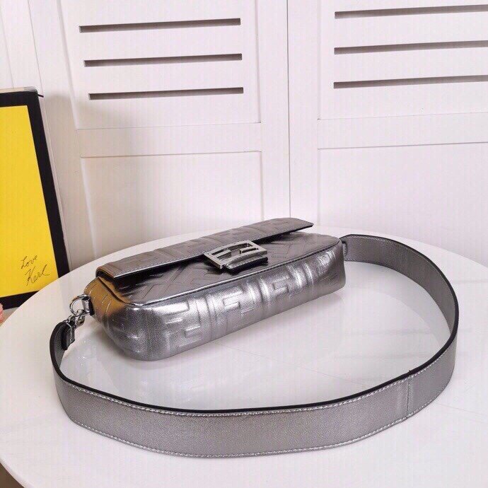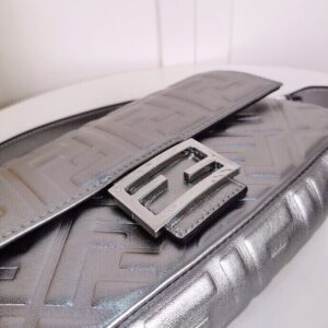Iconic medium Baguette bag with chain, made of soft, silver nappa leather with a 3D texture FF motif. Decorated with an FF clasp.