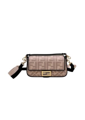 Iconic medium Baguette bag made of light pink canvas with a tone on tone embossed embroidered FF motif created trimmed in grey and embellished with an FF clasp. The bag can be carried by hand, or worn either on the shoulder or cross-body thanks to the handle and Pequin canvas shoulder strap, both detachable.