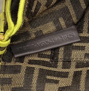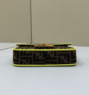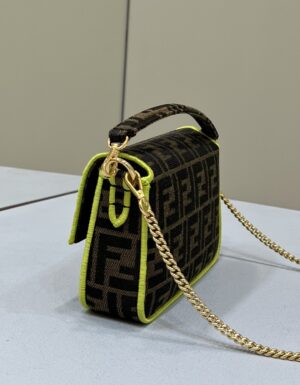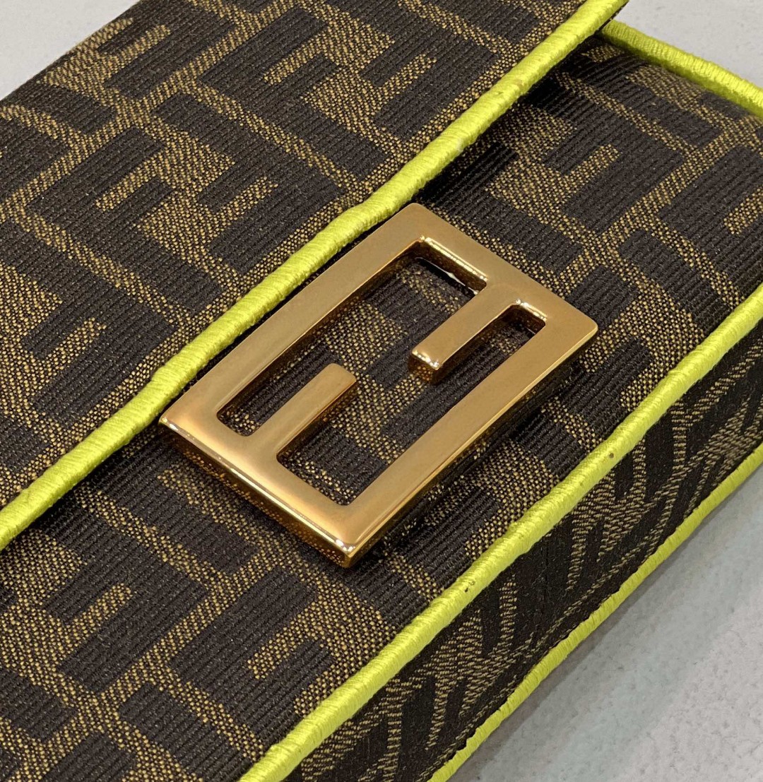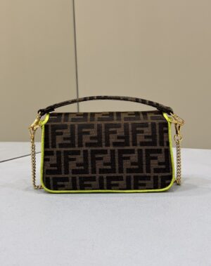 Iconic Small Baguette bag made of brown jacquard fabric with an FF motif, decorated with an FF clasp and trimmed with black embroidery.