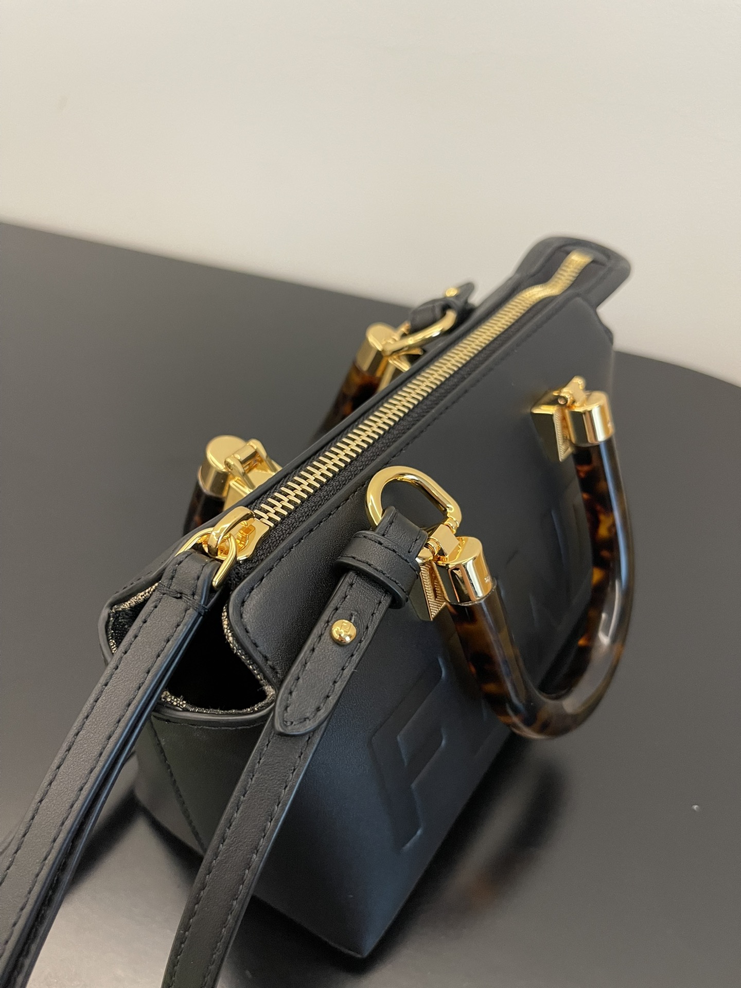The bag can be carried by hand with the handles, or worn either on the shoulder or cross-body with the adjustable, detachable shoulder strap. Tone on tone leather customisable pendant.