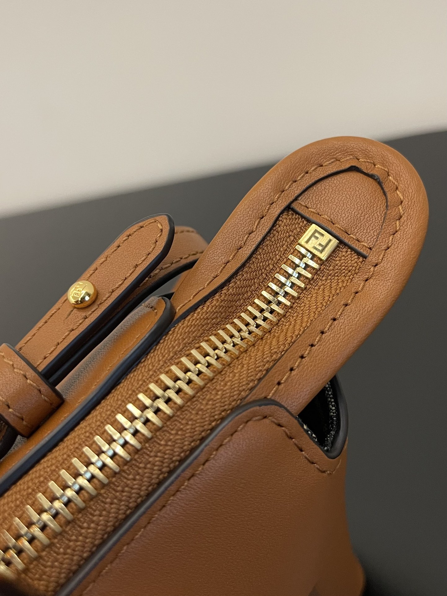 Iconic mini By The Way Boston bag, made of Brown leather with hot-stamped FENDI ROMA lettering. Zip fastening.