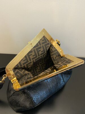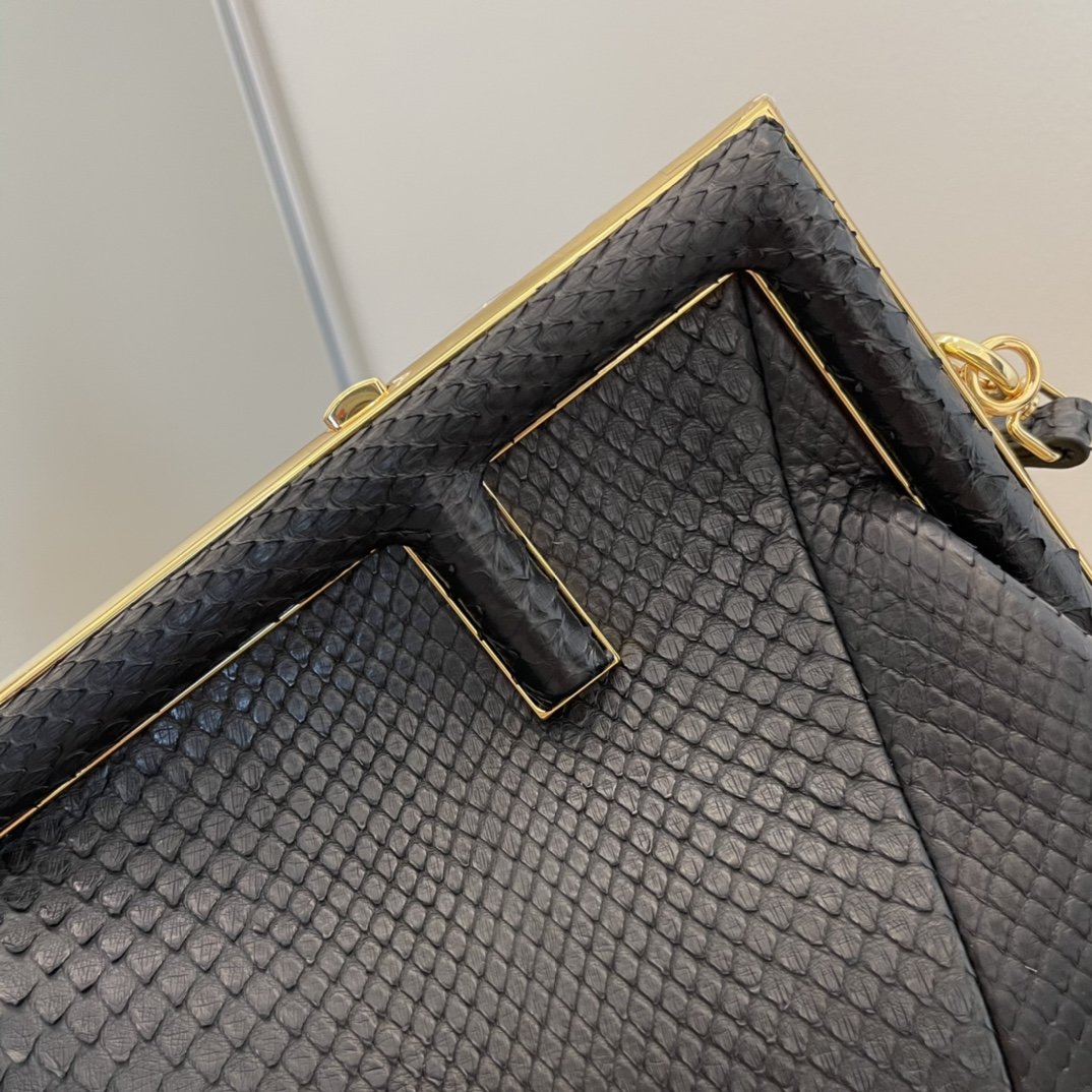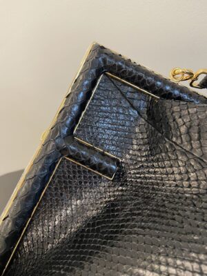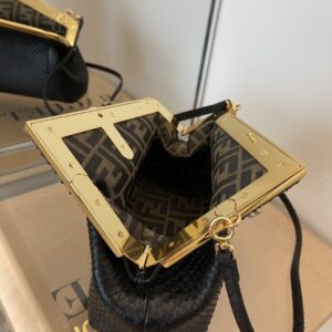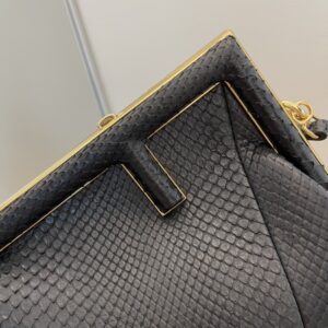 Small Fendi First bag made of exquisite, black python. Decorated with an F-shaped snap clasp covered in tone on tone python. The bag can be carried by hand as a clutch, or worn on the shoulder thanks to the adjustable, detachable python shoulder strap.