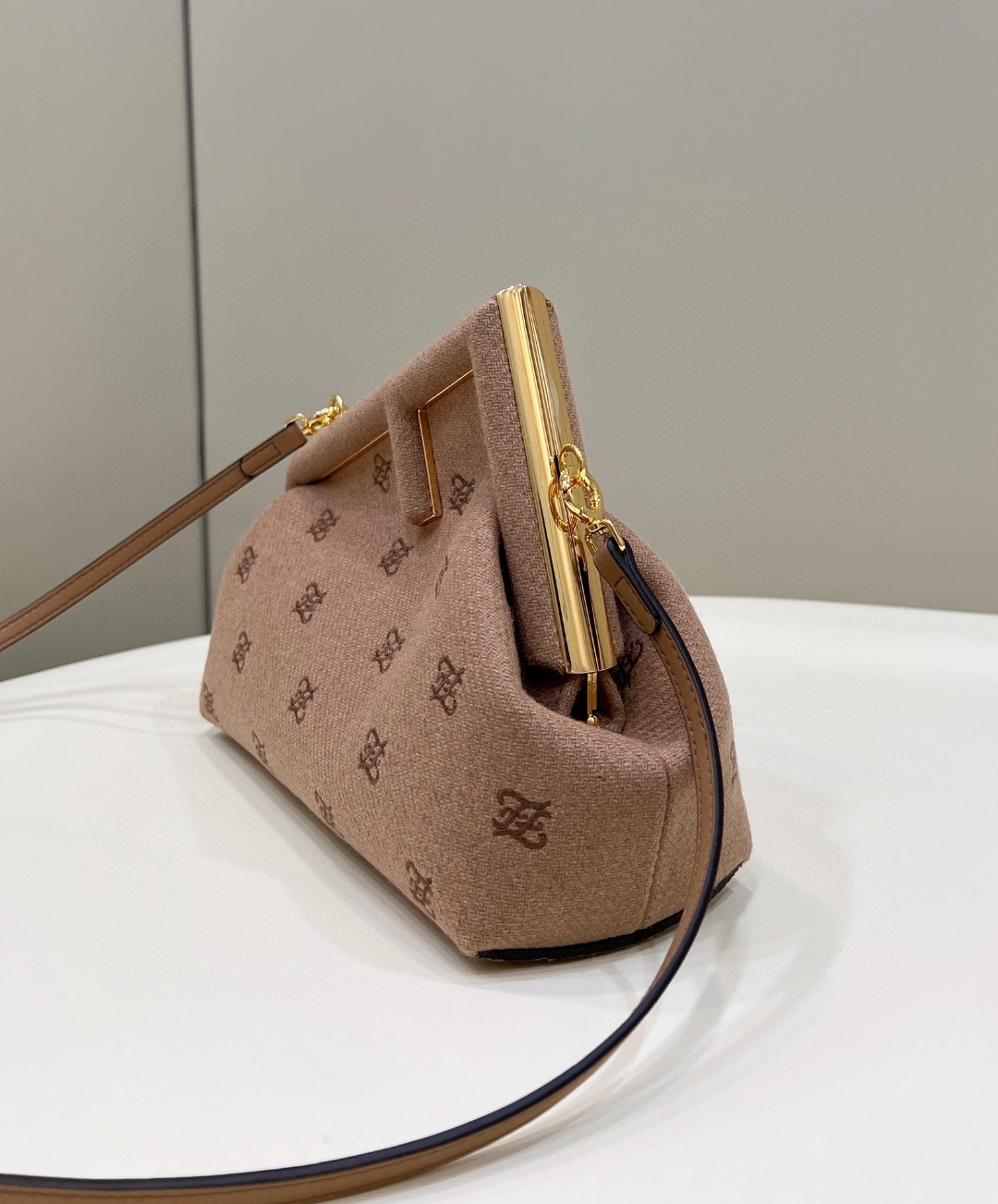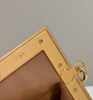 Small Fendi First bag made of soft, caramel coloured nappa leather, with metal macro F fastening bound in tone on tone nappa leather.