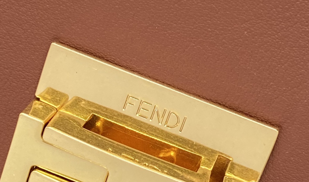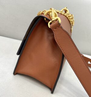 From signature pyramid stud embellishments to the famous double-F logo, this new season you will be presented with a collection that is filled with elegance, flair and confidence. Crafted in brown lamb skin, this small Kan U shoulder bag is a classic. Featuring a foldover top with push-lock closure, a gold-tone logo plaque, an internal slip pocket and a gold-tone chain shoulder strap.