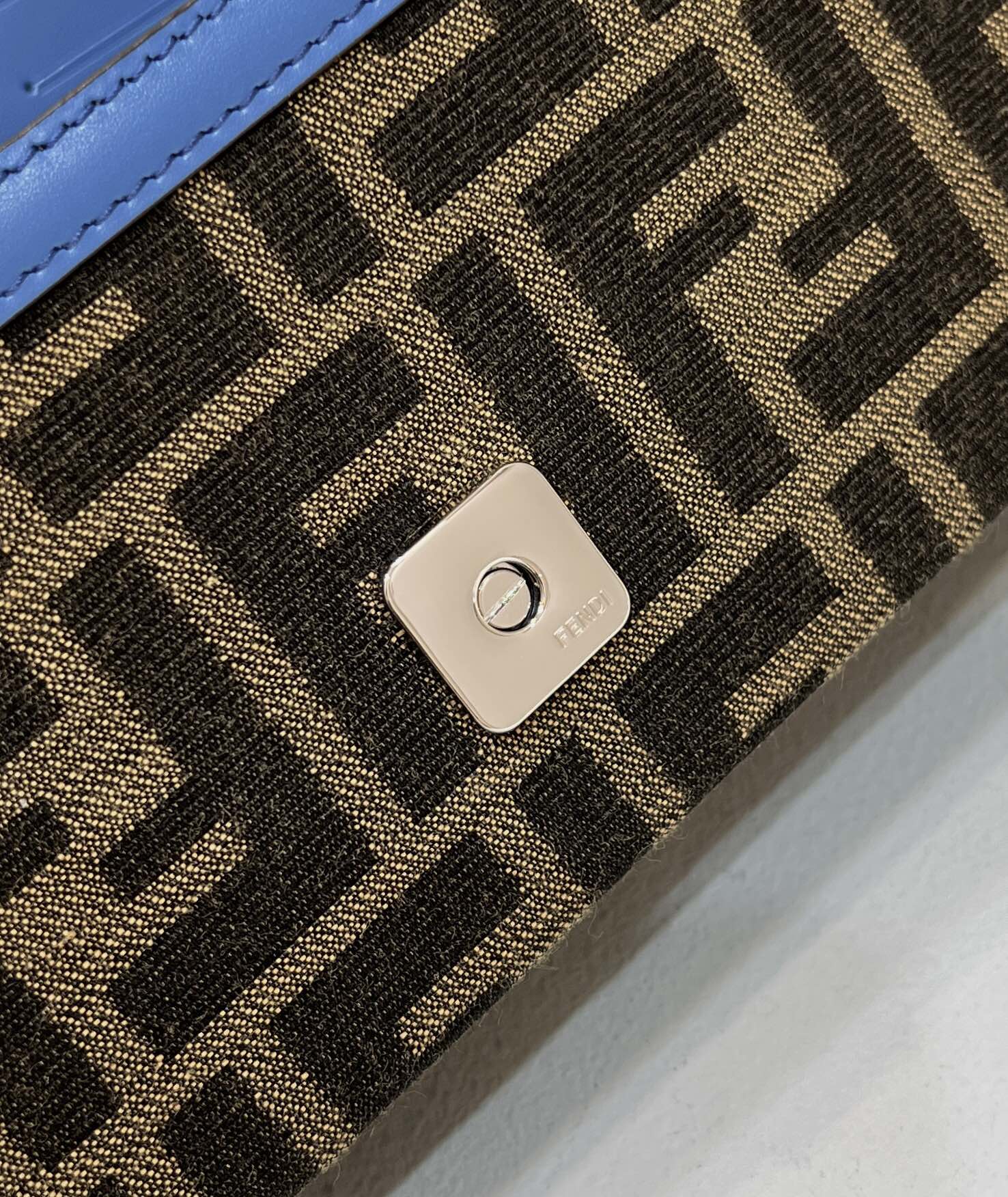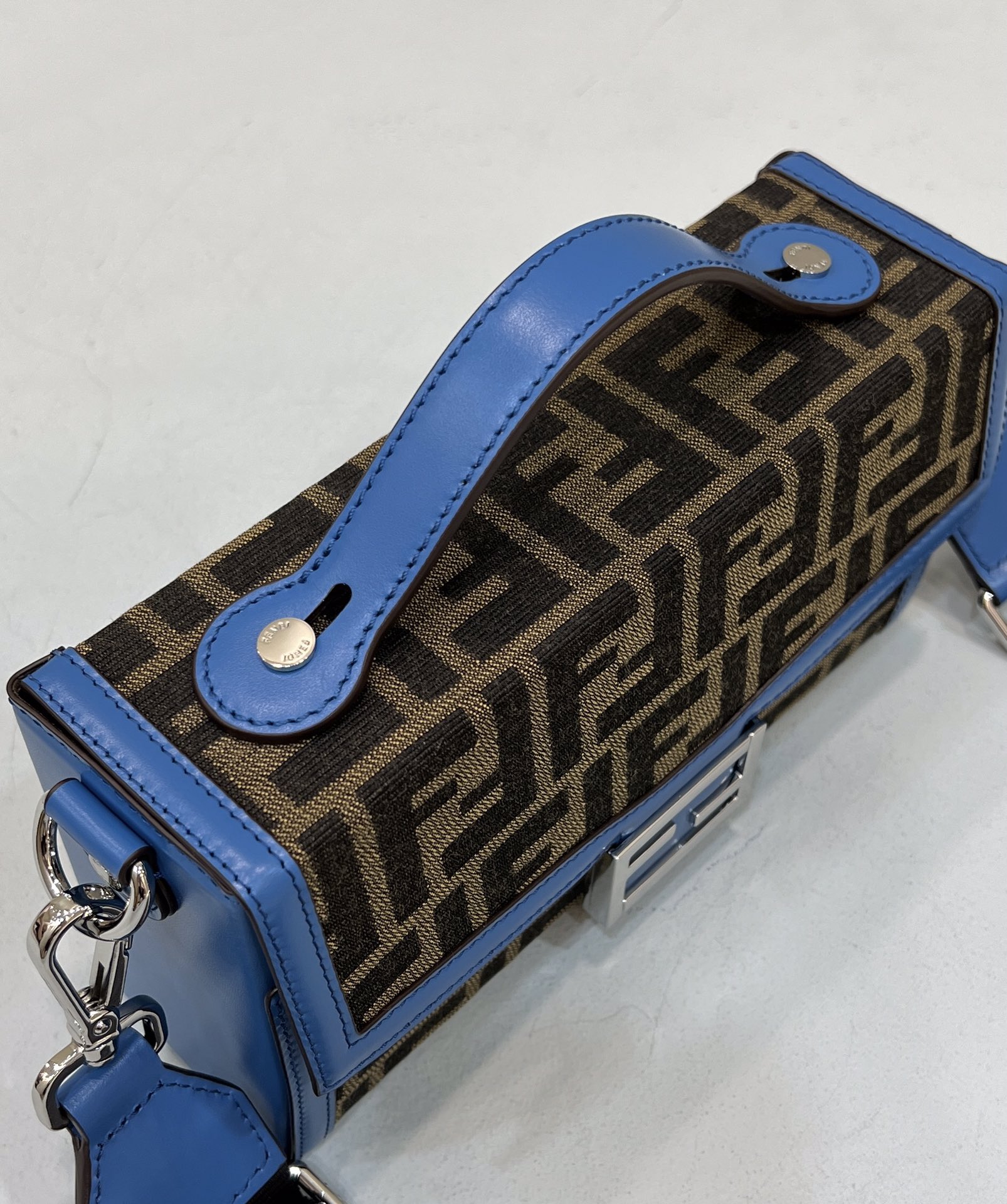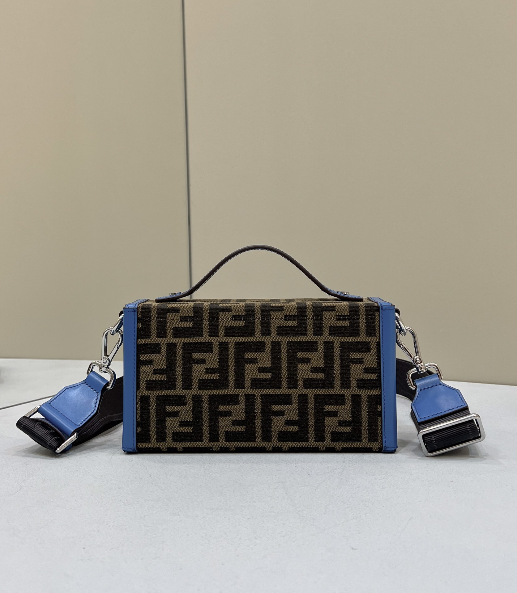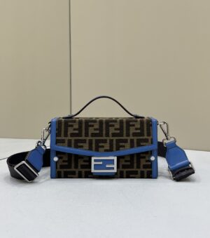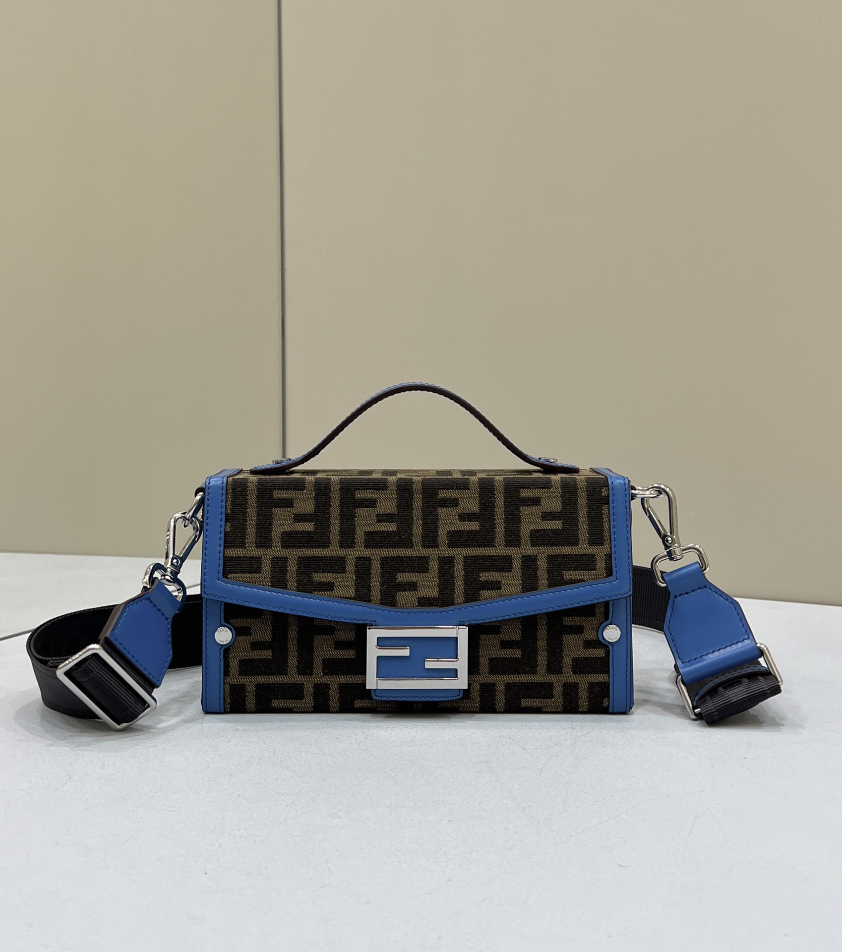 The fabric cross-body shoulder strap with FENDI lettering is adjustable and detachable