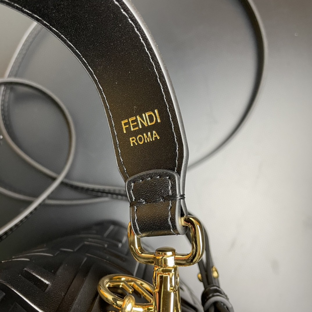 Mini Mon Tresor bucket bag with drawstring fastening and metal decorations in the Fendi logo shape. Two detachable shoulder straps, one long and one short, to wear the bag over the shoulder or cross-body. Made of black calf leather. Iconic FF pattern created in a raised print. Gold-finish metalware.