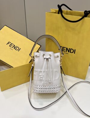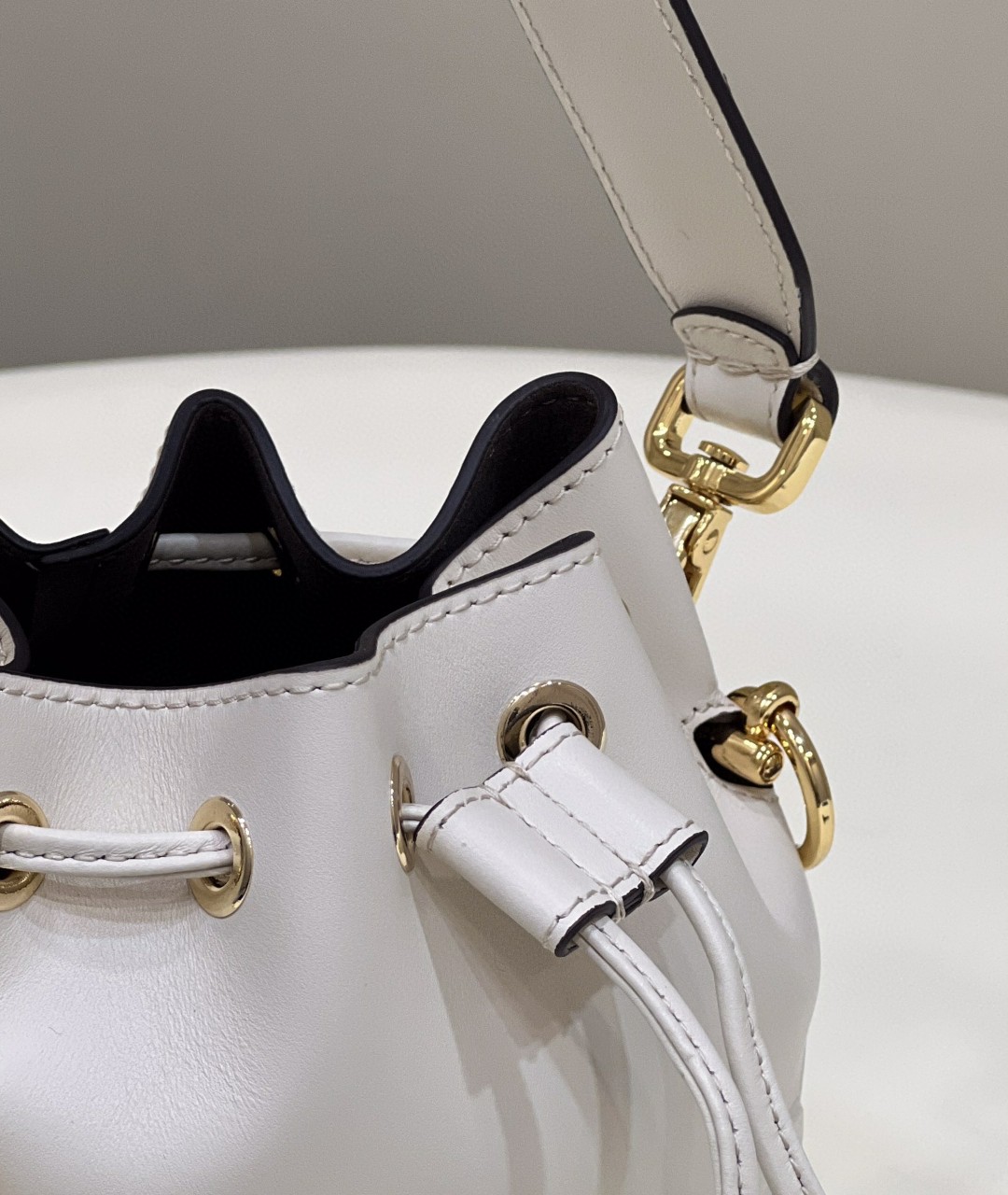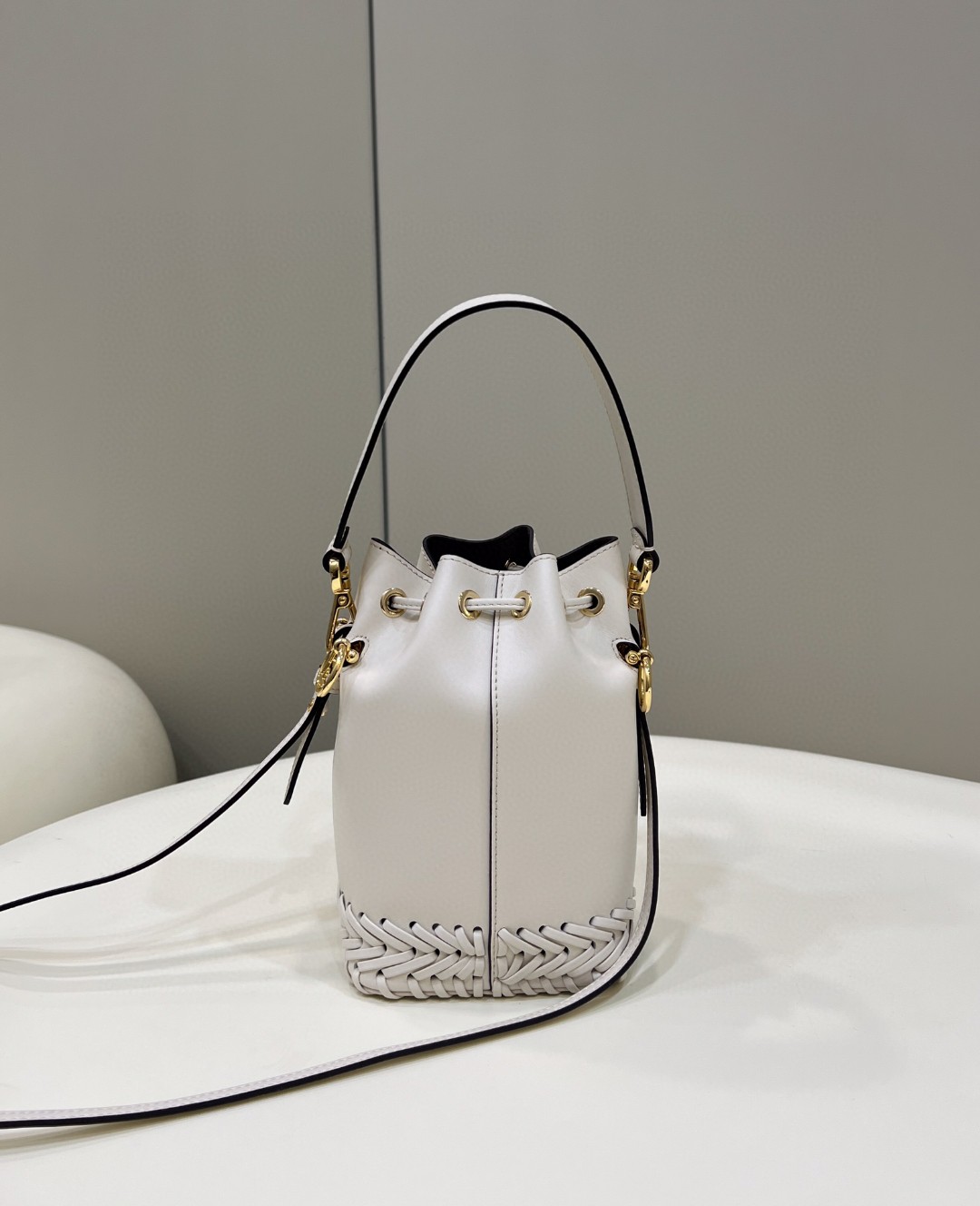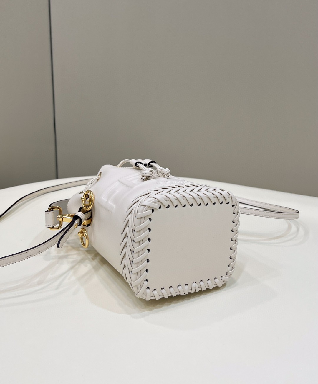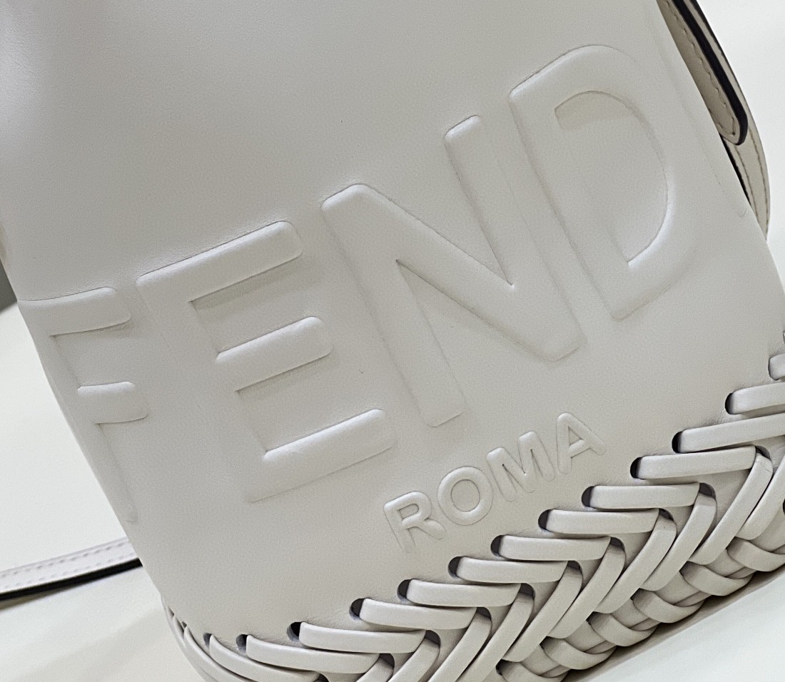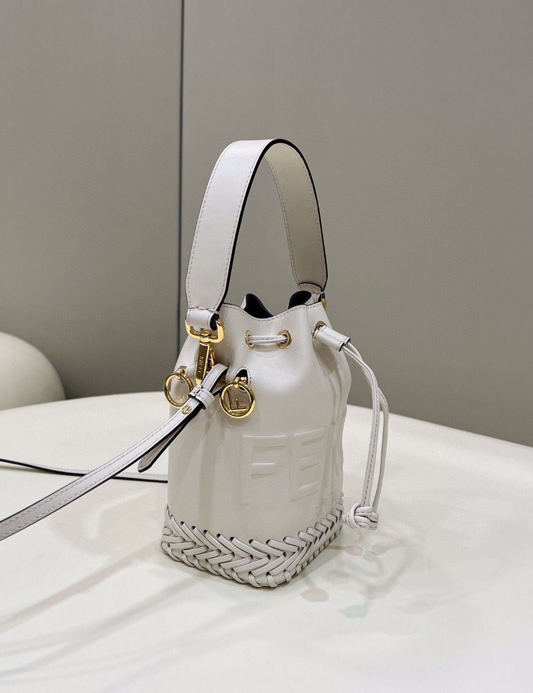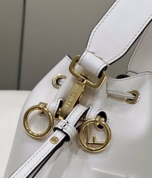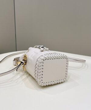 Small Mon Tresor bucket bag made of white leather with handmade tone on tone leather embroidery.