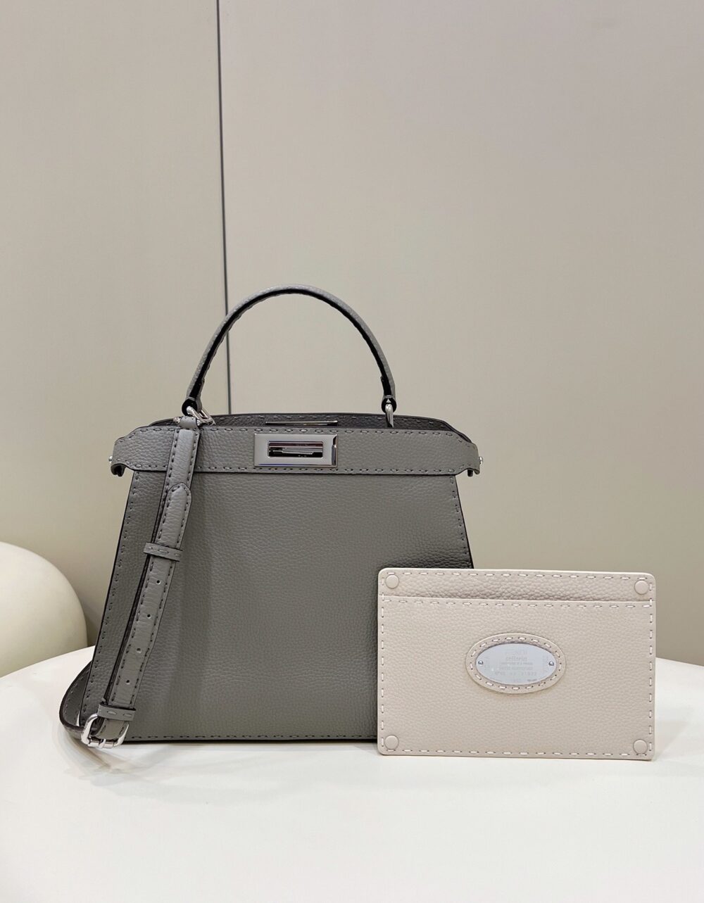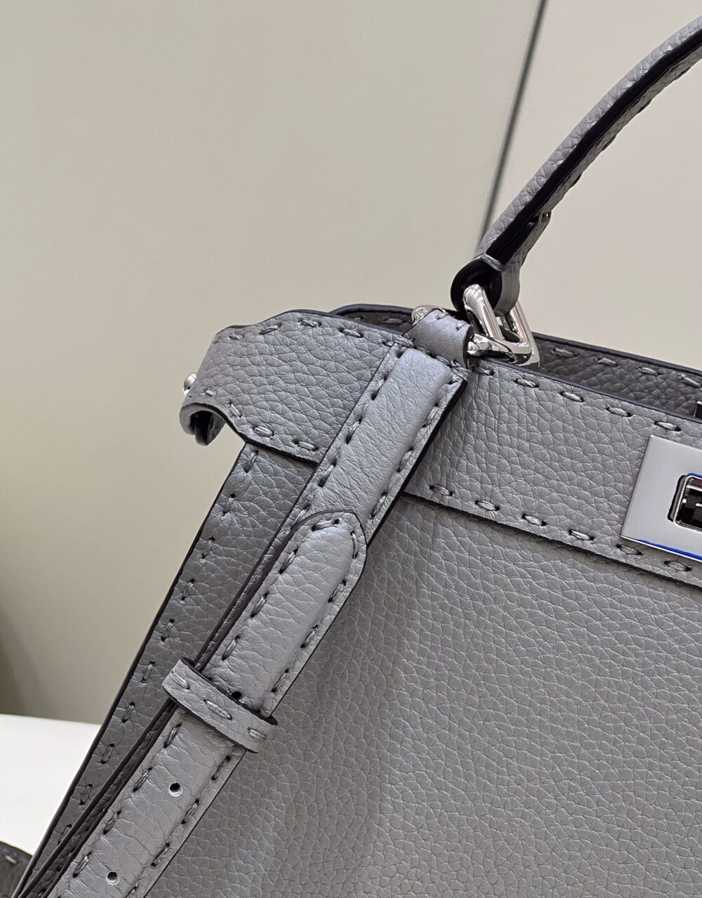 Medium Peekaboo ISeeU bag, made of gray Cuoio Romano topstitched by hand. The interior is organised into two compartments divided by a stiff partition, the front features the iconic twist lock, and there is a zip fastening on the back. The removable interior pocket. Can be carried by hand or on the shoulder thanks to the handle and adjustable, detachable shoulder strap.