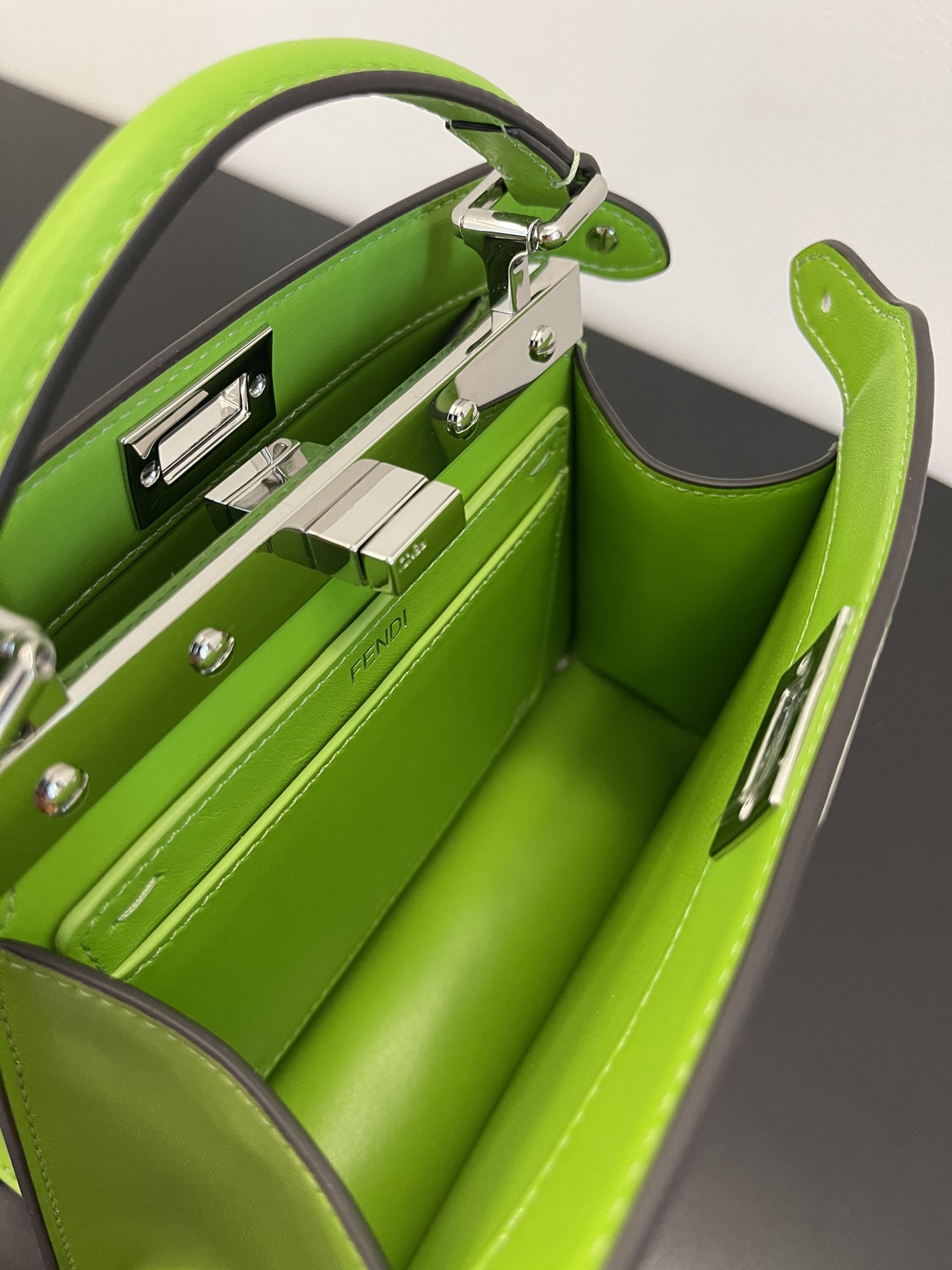 Iconic Peekaboo ISeeU bag in an ideal, compact size. Made from soft, padded, Chartreuse nappa leather and embellished with the classic twist lock on both sides.