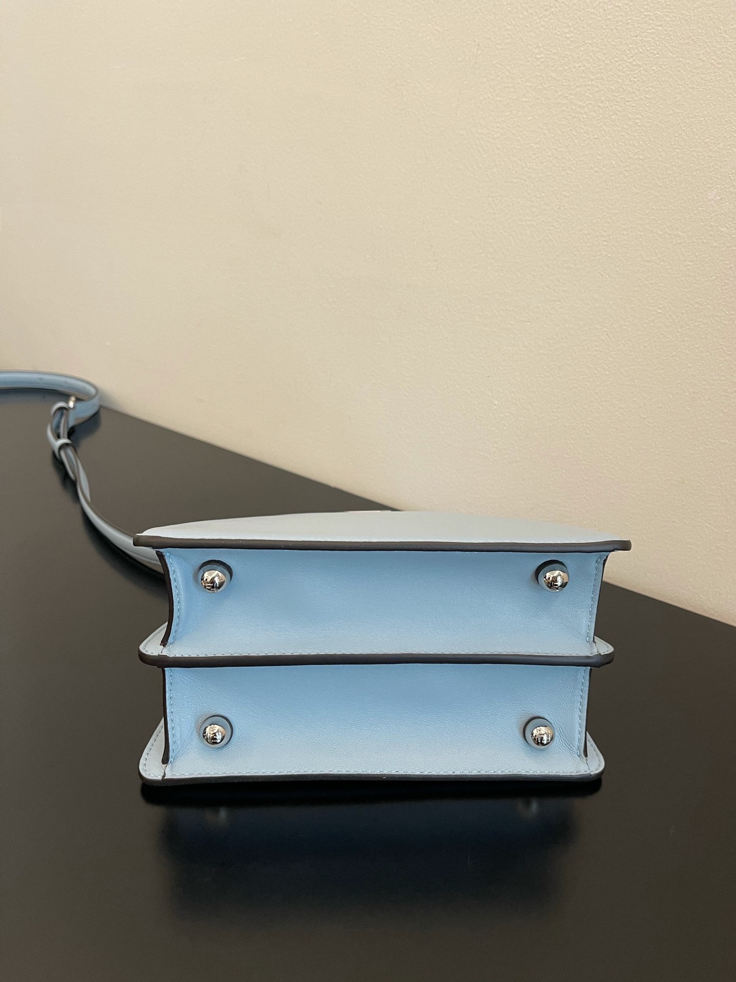 Iconic Peekaboo ISeeU bag in an ideal, compact size. Made from soft, padded, Light Blue nappa leather and embellished with the classic twist lock on both sides.
