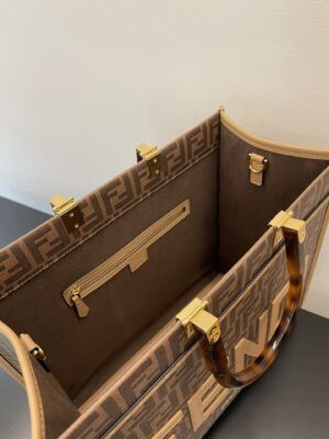 Medium Sunshine shopper made of natural-coloured woven straw with a moss-stitch effect, with black straw “FENDI ROMA” embroidery and stiff tortoiseshell-effect plexiglass handles.