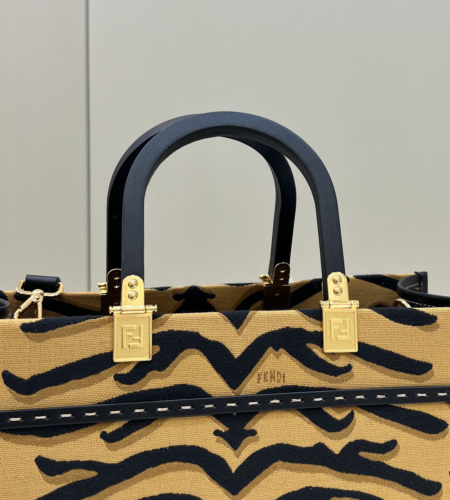Medium Sunshine Shopper bag made of jacquard fabric featuring the Tiger motif in black and dark yellow, to celebrate the year of the tiger. Stiff leather handles in black.