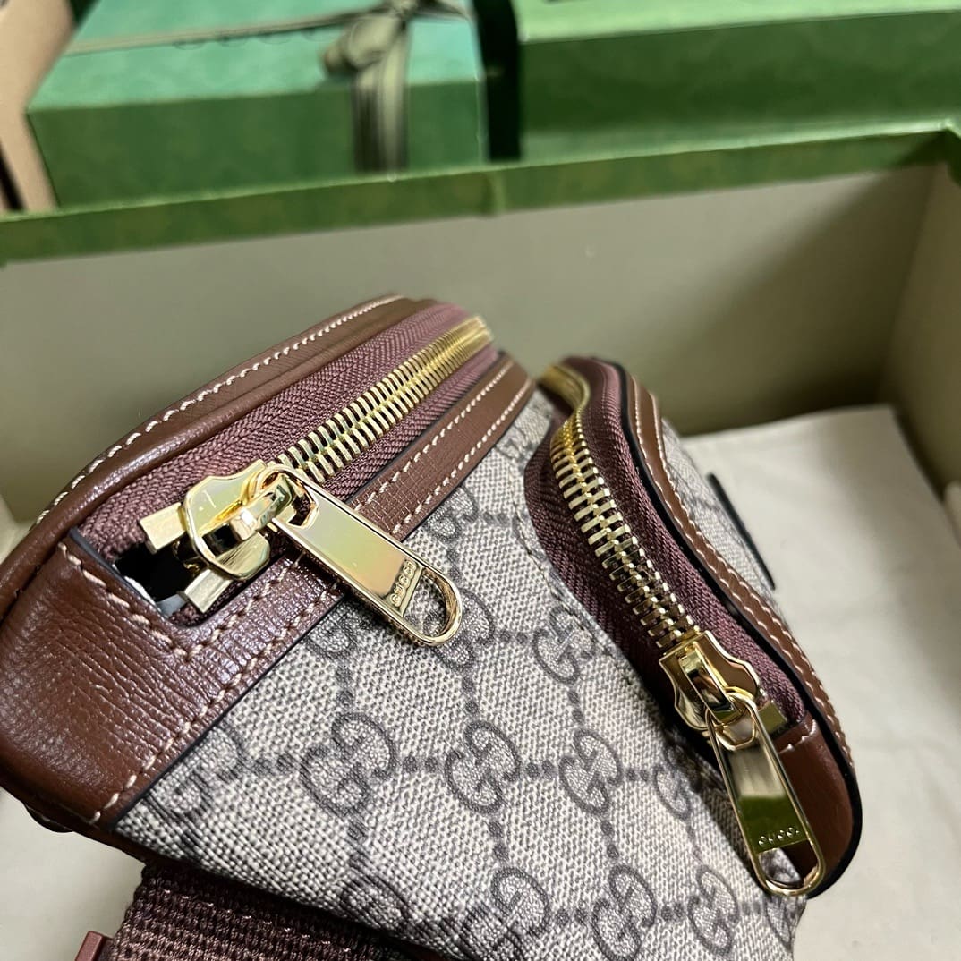 Materials, colours and House codes come together to infuse styles with a vintage feel. Here, this belt bag is crafted from beige and ebony GG Supreme canvas with a brown leather trim. The style is completed by one of Gucci’s most historic codes—the Interlocking G.