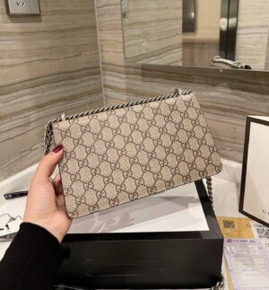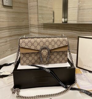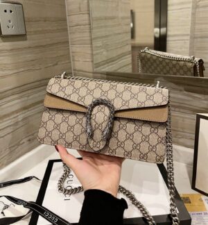 A structured GG Supreme canvas bag with our textured tiger head closure-a unique detail referencing the Greek god Dionysus, who in myth is said to have crossed the river Tigris on a tiger sent to him by Zeus. The sliding chain strap can be worn multiple ways, changing between a shoulder and a top handle bag.