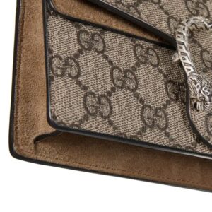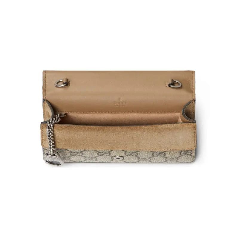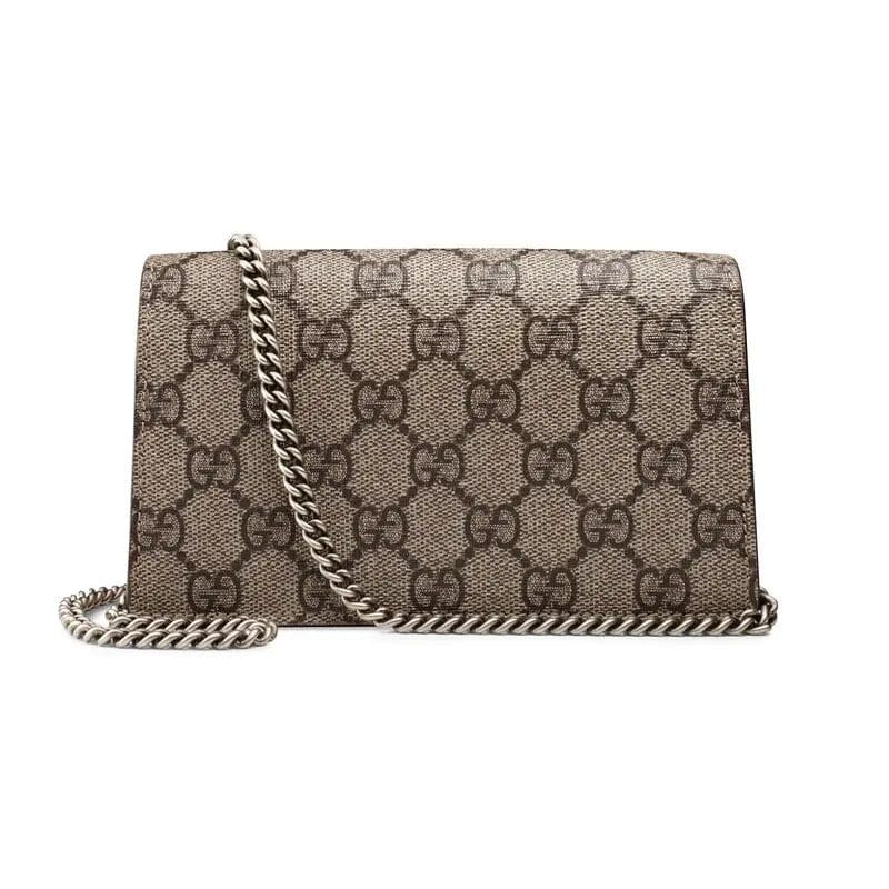 The structured GG Supreme canvas chain super mini handbag comes with a keychain that can be used to tie the bag to another larger handbag. The closure is finished with a textured double tiger head buckle – a detail inspired by the Greek god Dionysus, who in mythology rode across the Tigris on a tiger sent by Zeus. ).