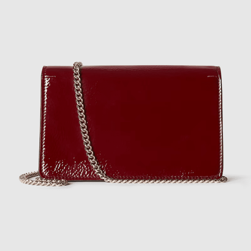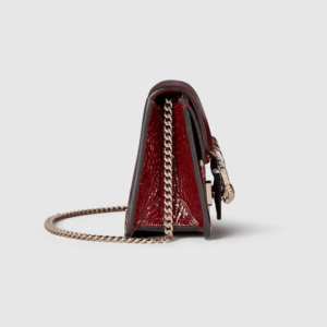 A shiny patent leather, in the signature Rosso Ancora shade of red, brings a fresh take to the Dionysus’ well-structured design, while creating contrast with the signature tiger head hardware in a light gold tone. A suede leather lining completes the style with an elegant finish.