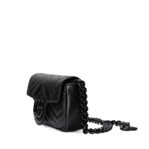 Accessories continue to come to the fore of the Creative Director’s collections. A distinctly contemporary accessory, the belt bag is presented in new ways throughout the Gucci narrative, emphasising different elements of the versatile style. Here, it is introduced as part of the GG Marmont universe in white chevron matelassé leather with a chain strap.
