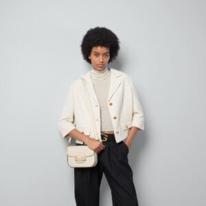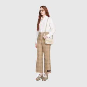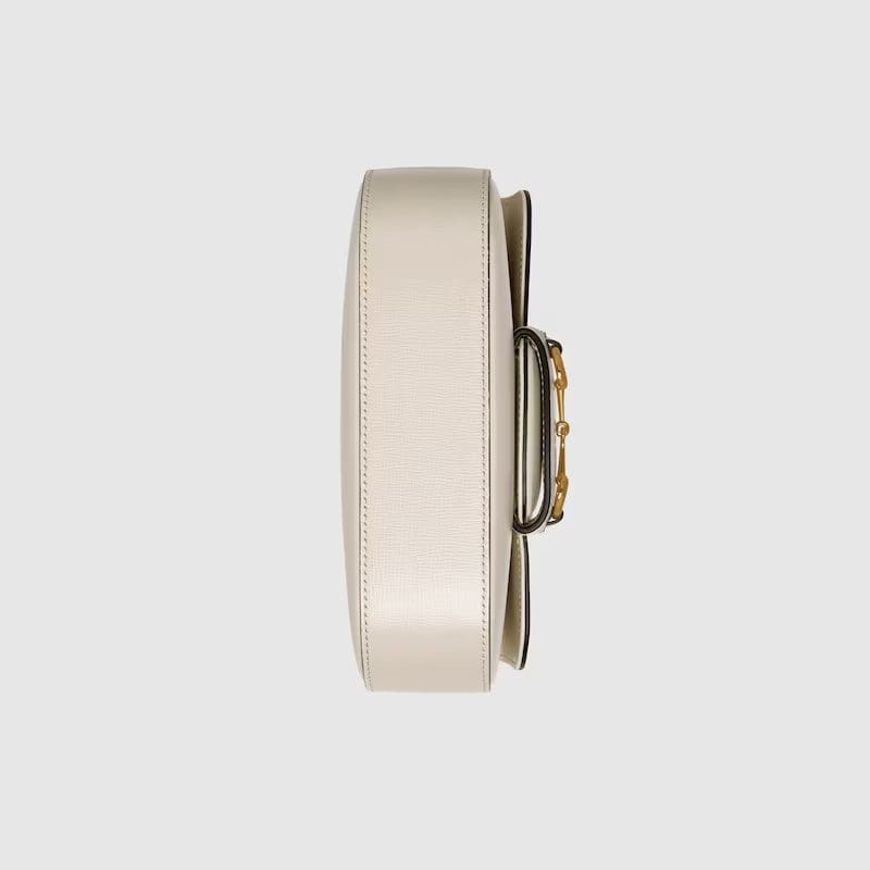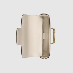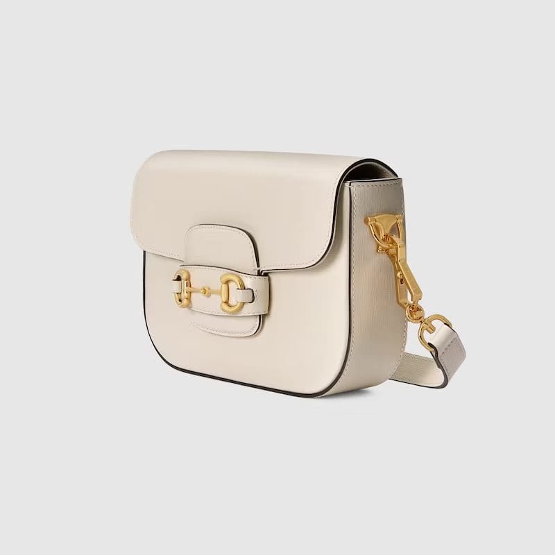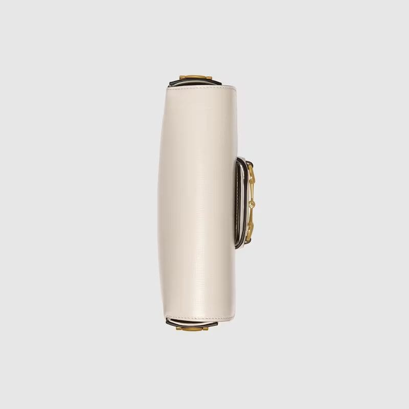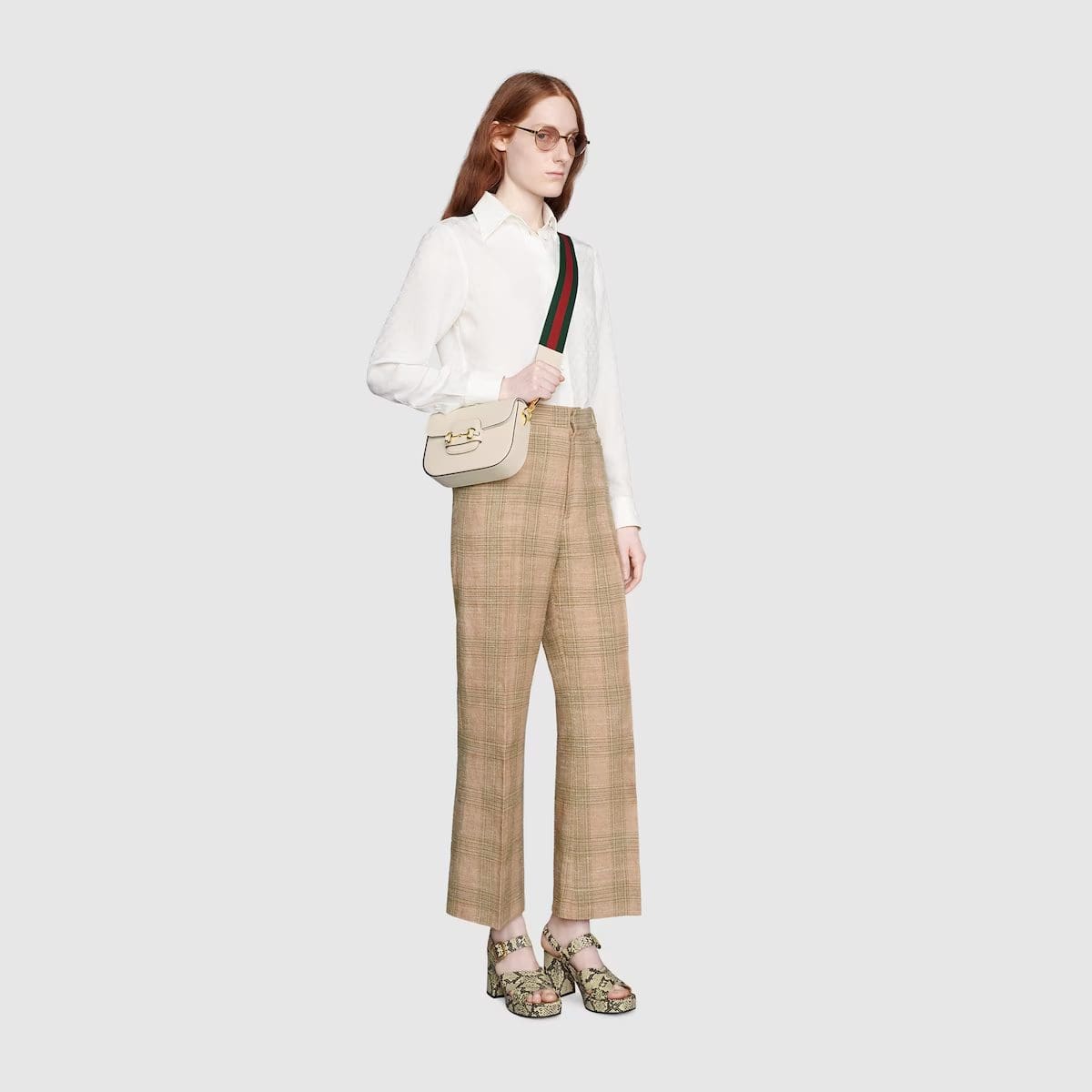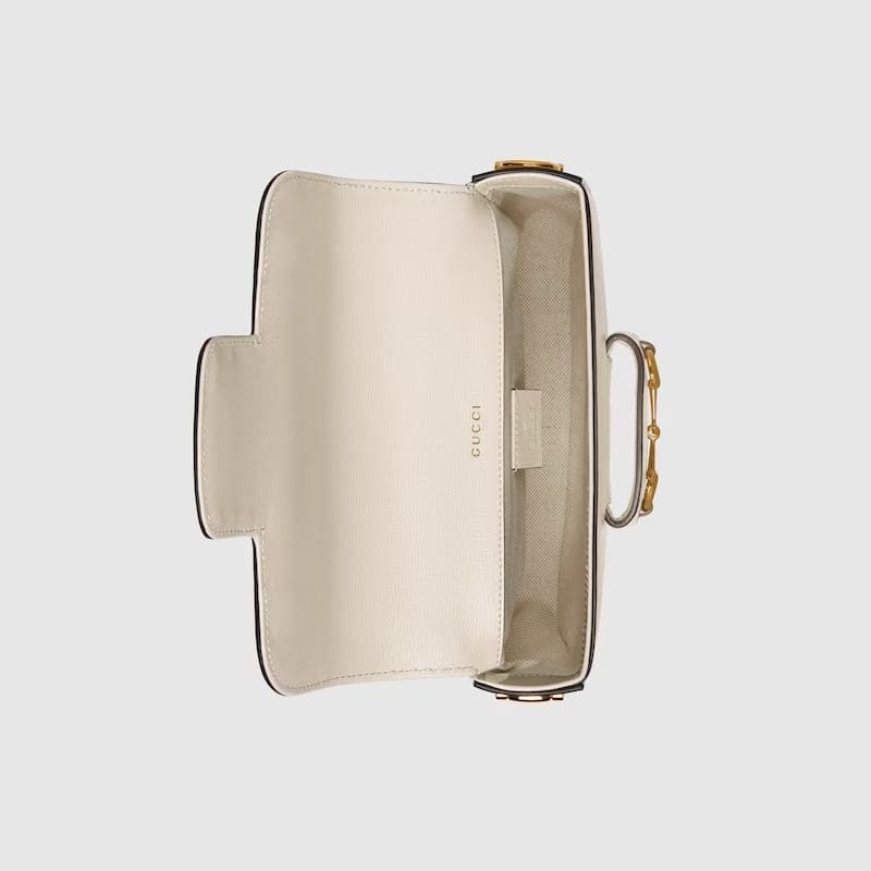 Petite versions of the Gucci Horsebit 1955 add a hybrid twist to the vintage inspired line. Enriched with two different shoulder straps, the white leather mini bag’s character transforms from understated elegance with a tonal leather strap to a strong logo feel thanks to a red and green Web option.