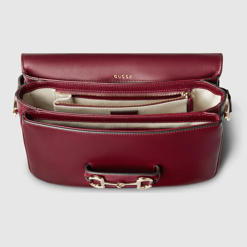 The Gucci Horsebit 1955 Soft continues to highlight its iconic double ring and bar hardware. This small shoulder bag style is crafted from Gucci Rosso Ancora red soft leather with natural shine.