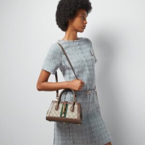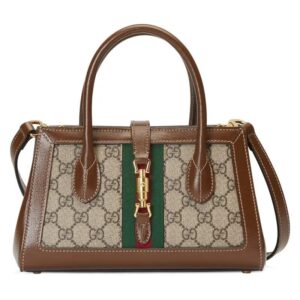The Jackie 1961 line is further elevated through new sizes and styles, including a rectangular-shaped version with a top handle and detachable shoulder strap. The gold-toned piston hardware appears against the archival green and red Web stripe.