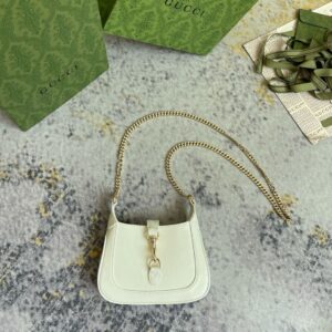 The Jackie Notte is a new creation for Gucci by Creative Director Sabato De Sarno. This bag exudes the confident allure of the classic Jackie bag, with a new silhouette and exquisite details for a modern night out. Made from the finest leather, this Jackie Notte mini bag is crafted in ivory white and features a striking hook closure and a light gold Gucci monogram chain.