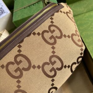 First seen as part of Gucci Aria, the jumbo version of the emblematic GG motif returns atop signature luggage pieces, imbuing each design with a pronounced logo feel. This belt bag is accentuated by the signature green and red House Web, a contemporary take on a Gucci archival belt buckle from the ’70s.