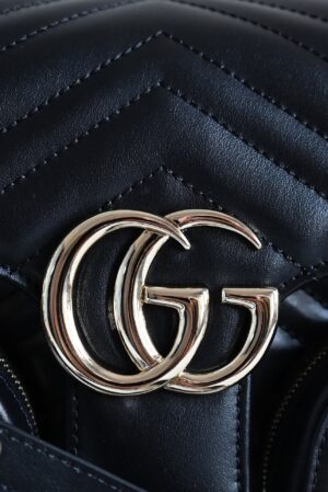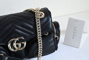 The GG Marmont line has always combined innovative material and design, and for Pre-Fall, multiple zip pockets placed on the outside further emphasize the geometry and sophistication of the matelassé chevron leather. Gucci Ross Ancora leather lining, light gold toned hardware, and an adjustable leather and chain shoulder strap completes this small shoulder bag.
