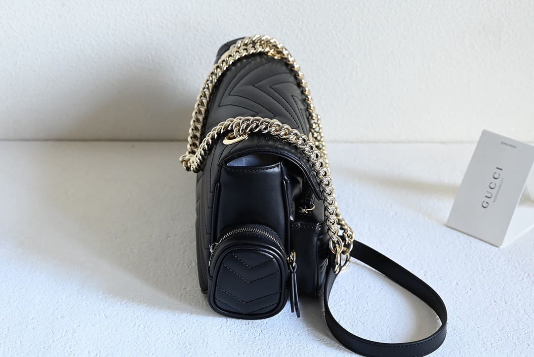 The GG Marmont line has always combined innovative material and design, and for Pre-Fall, multiple zip pockets placed on the outside further emphasize the geometry and sophistication of the matelassé chevron leather. Gucci Ross Ancora leather lining, light gold toned hardware, and an adjustable leather and chain shoulder strap completes this small shoulder bag.