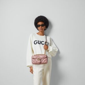The GG Marmont shoulder bag presents a softly padded version of the pink GG Matelassé leather with small Double G studs, and a twisted torchon Double G embellishment. The sliding chain strap smoothly transforms from a single shoulder length to a doubled top handle length for multiple ways to wear the bag.