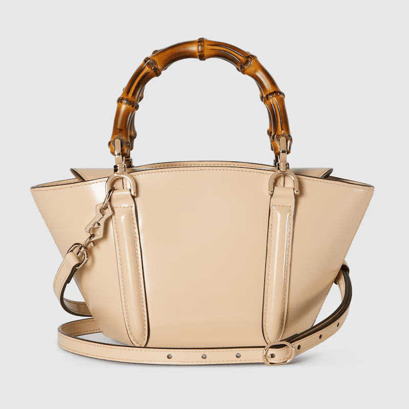 Introducing a bamboo top handle bag, this style from the women’s Fall Winter 2024 runway blends the House’s expert craftsmanship with its iconic motif. The basket-shaped bag reveals a hexagonal base, highlighting its artisanal construction. The mini size in light beige is complete with a detachable shoulder strap.