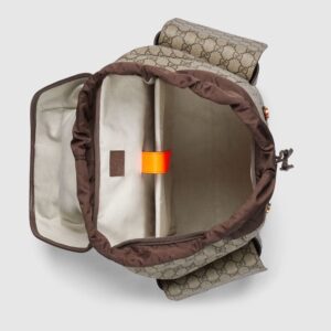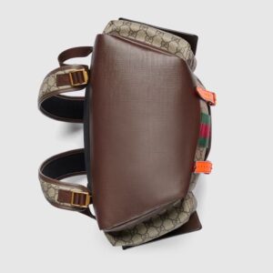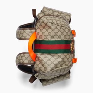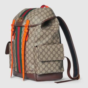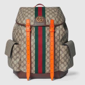 Reflecting the Creative Director’s contemporary vision, the Ophidia lines come to life with a pop of fluorescent orange. Combining the GG motif and Web stripe with a modern hue launches signature travel pieces into the metropolis, such as this backpack complete with side pockets.