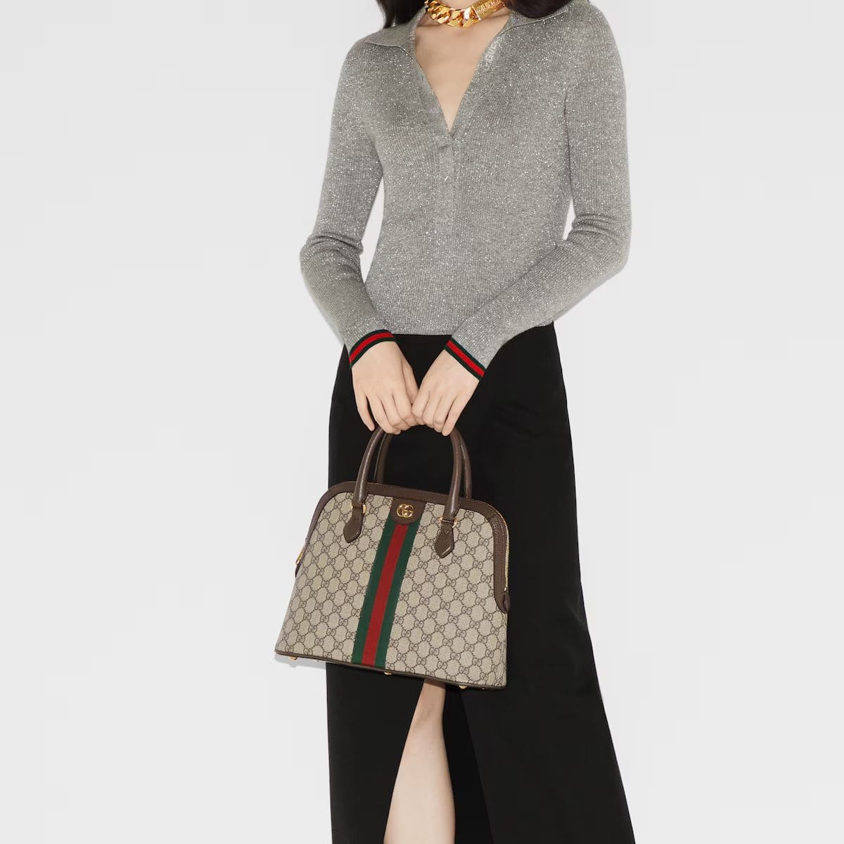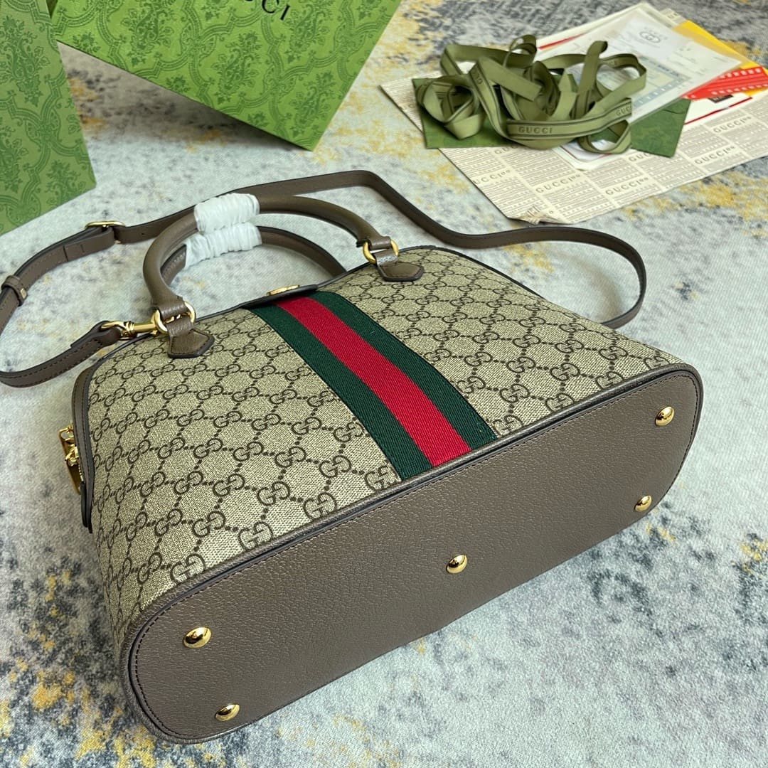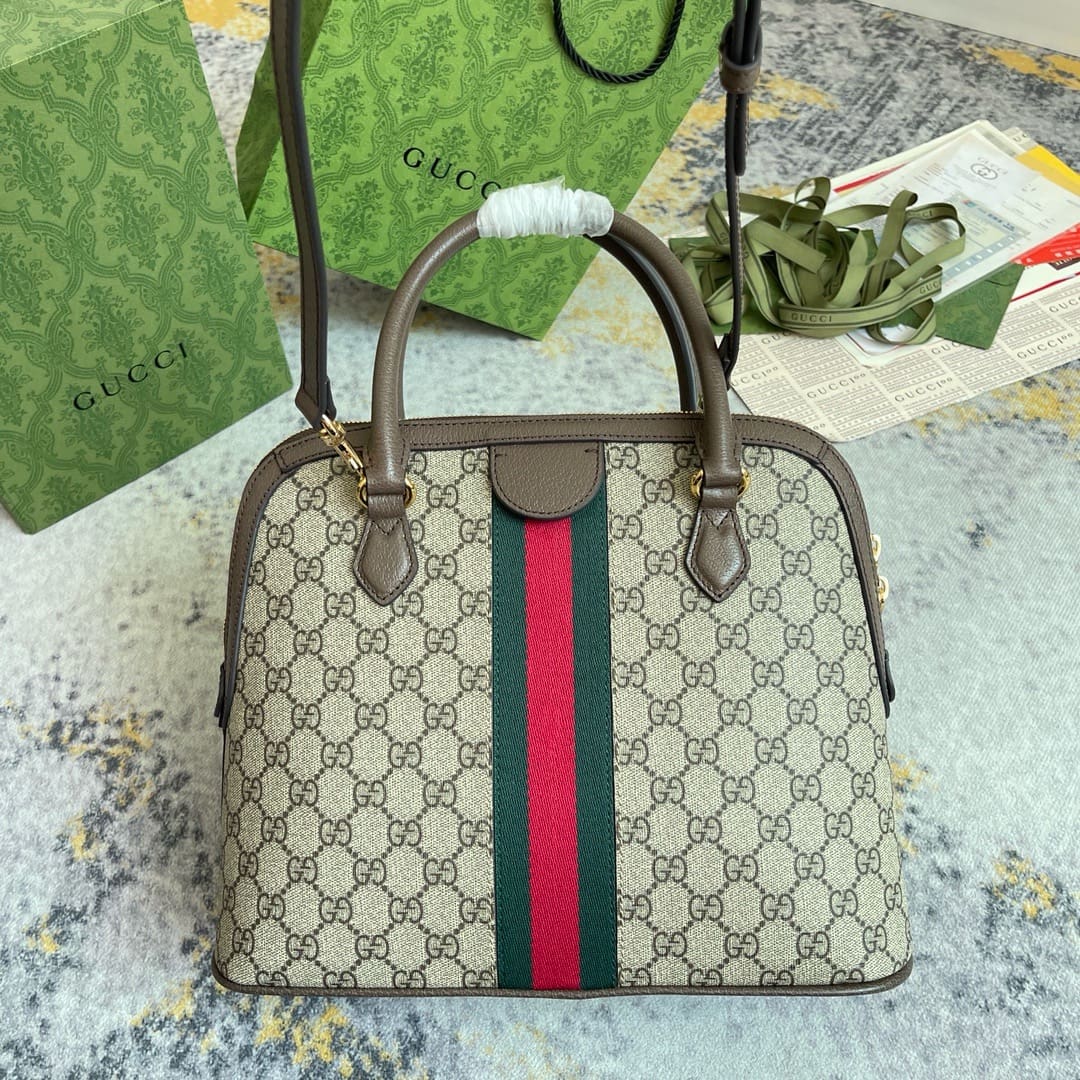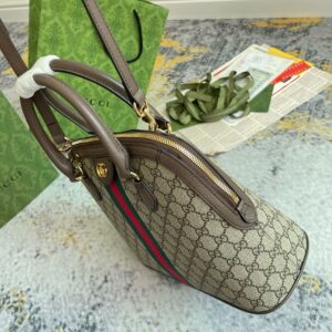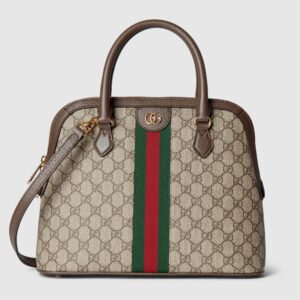 The world of Ophidia continues to evolve with new iterations for the Pre-Fall collection. This medium-sized top handle bag is made of beige and ebony GG Supreme canvas and has a detachable shoulder strap. The House iconic Web stripe and Double G hardware complete the piece.