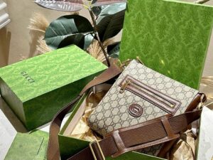 The signature GG Supreme canvas is an evergreen of the House—soft and malleable, it’s crafted from a coated microfibre fabric. Here it appears in a beige and ebony colour palette for this messenger bag, complete with brown leather trim.