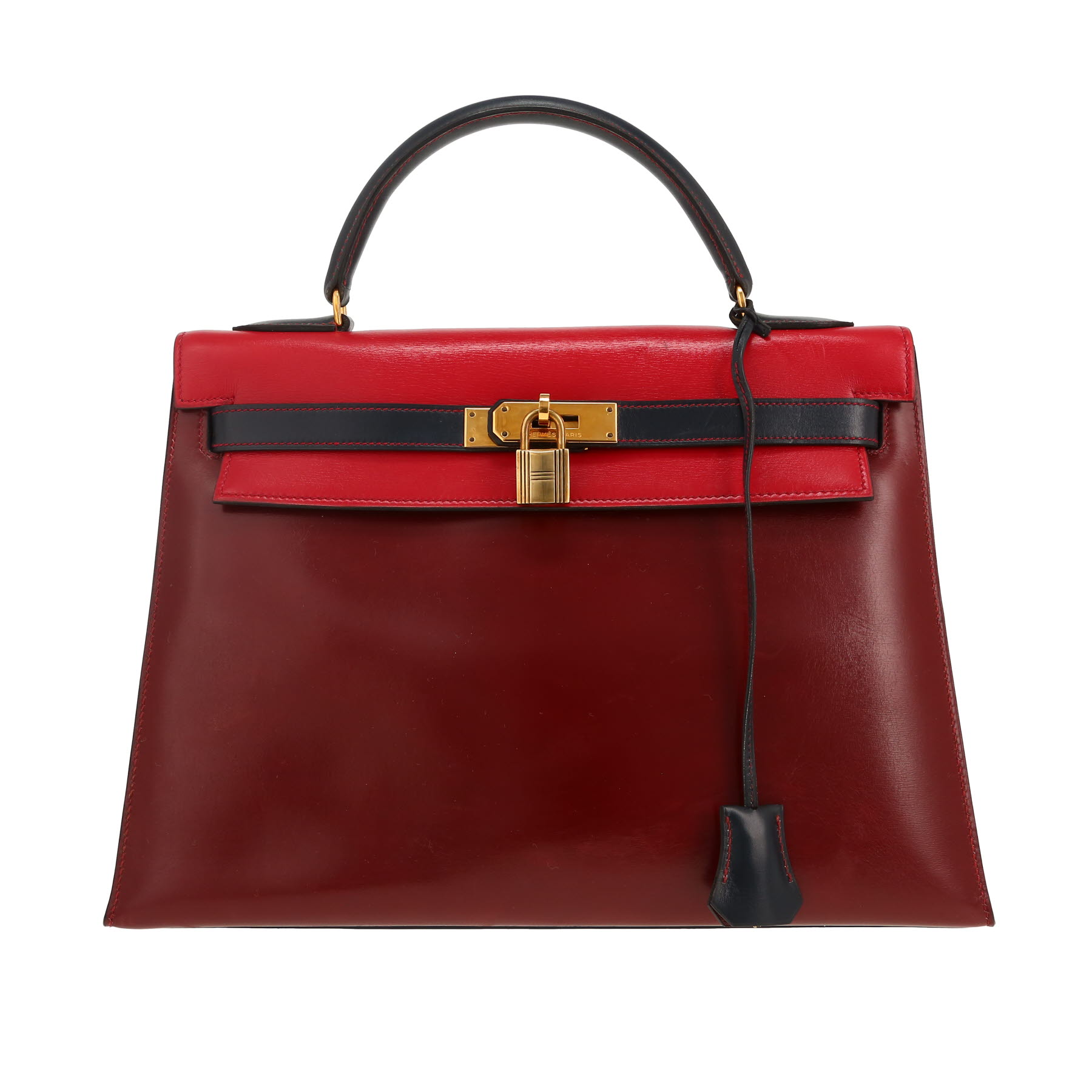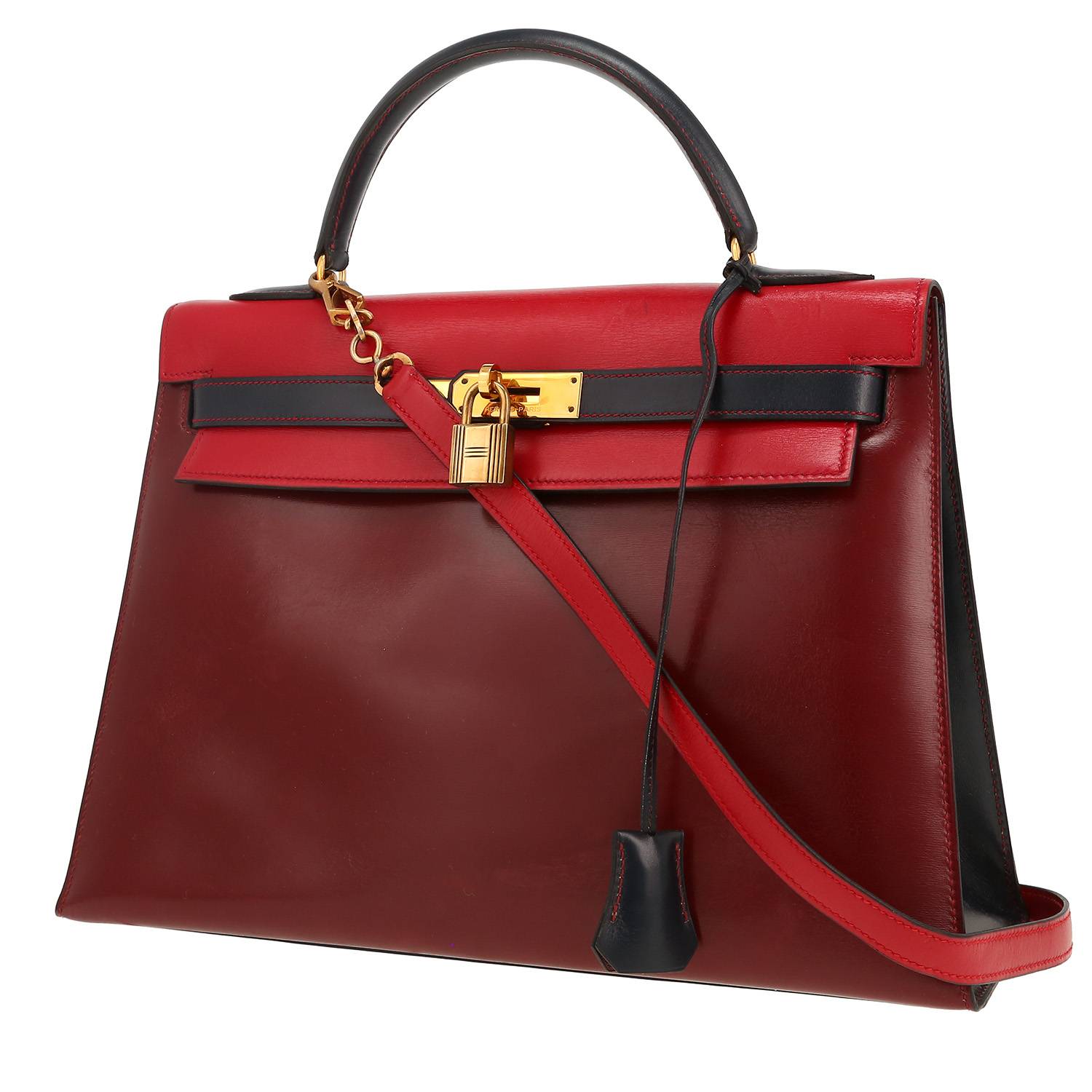 Hermès Kelly 32 cm handbag in red, navy blue and burgundy box leather