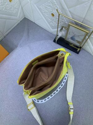 This bag is made from Yellow Monogram-embossed puffy calfskin with a chunky chain in contrasting white acetate. The chain enables shoulder carry while a wide shoulder strap allows shoulder and cross-body wear; both are detachable